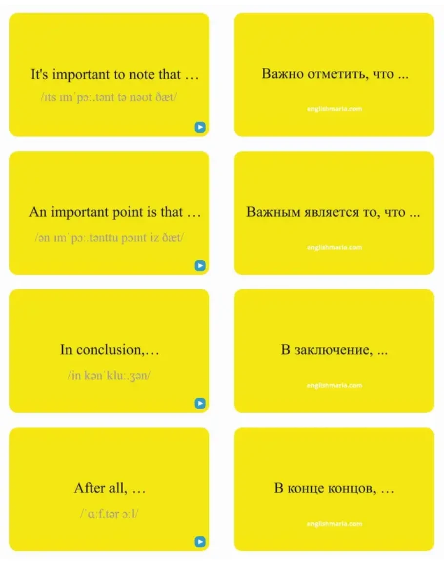 240 карточек (40 вводных фраз) - Набор основан на четырёх самых часто употребляемых конструкциях