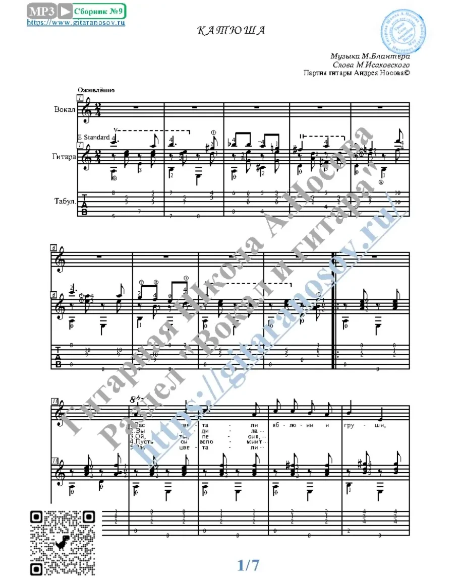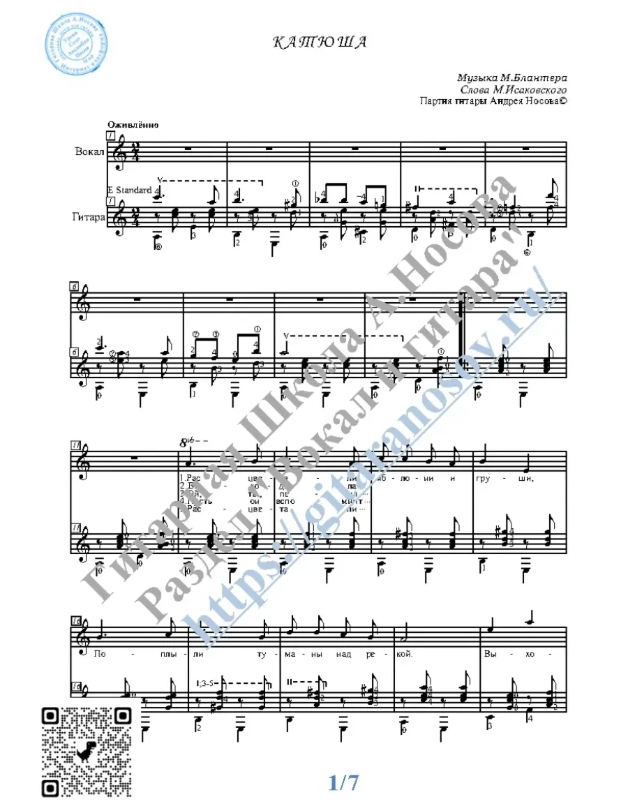 Кликните "Подробнее" для получения дополнительной информацииВашему вниманию предлагается композиция "Катюша (муз.М.Блантера, сл.М.Исаковского)", предназначенная для вокала в сопровождении 6-ти струнной гитары. Запись выполнена нотами и включает в себя партию вокала с подтекстовкой, партию гитары с подробнейшей аппликатурой и текст песни (НА РУССКОМ).