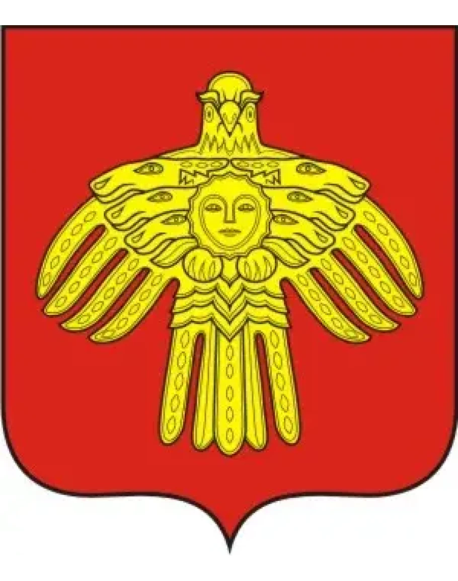 герб Республики Коми представляет собою исполненное по мотивам пермского звериного стиля изображение золотой хищной птицы, помещенной на красном геральдическом щите; на груди птицы - лик женщины в обрамлении 6 лосиных голов.