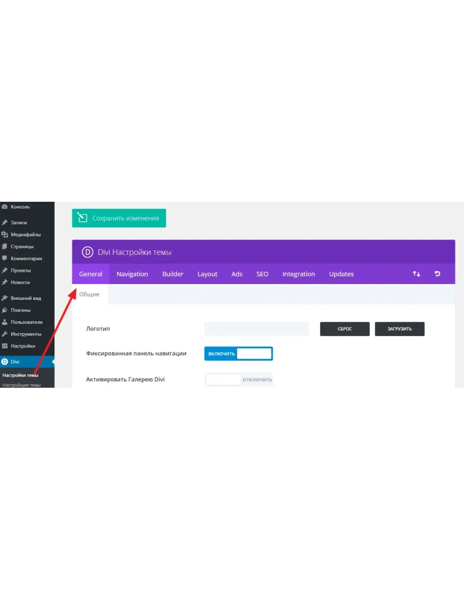 Доступ к настройкам темы Divi можно получить в меню панели инструментов WordPress в разделе «Divi» > «Настройки темы»