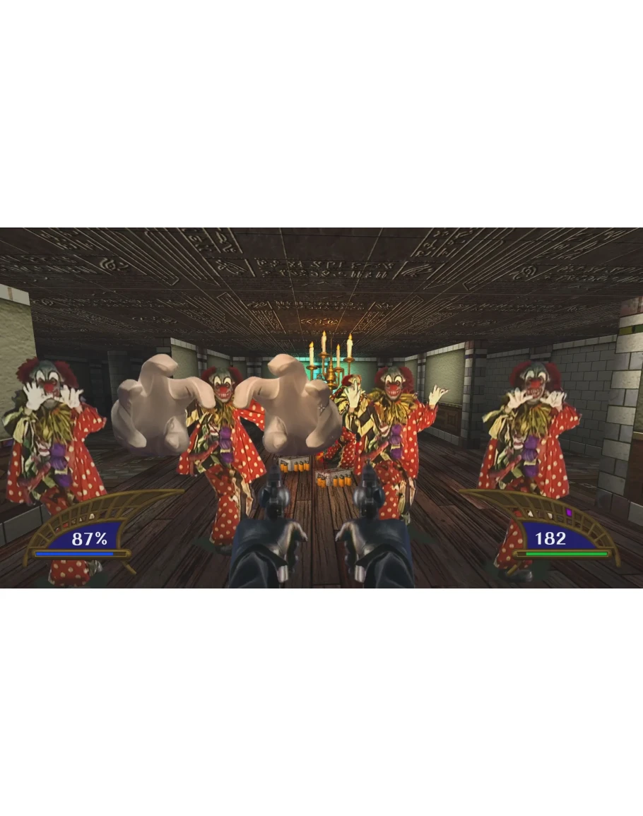 The remastered edition of Killing Time: Resurrected features toggleable high-resolution character artwork/sprites from the original 3DO and PC versions of the game, upscaled environmental texturing, smoother gameplay, more responsive controls, and expanded control and key-bind settings.