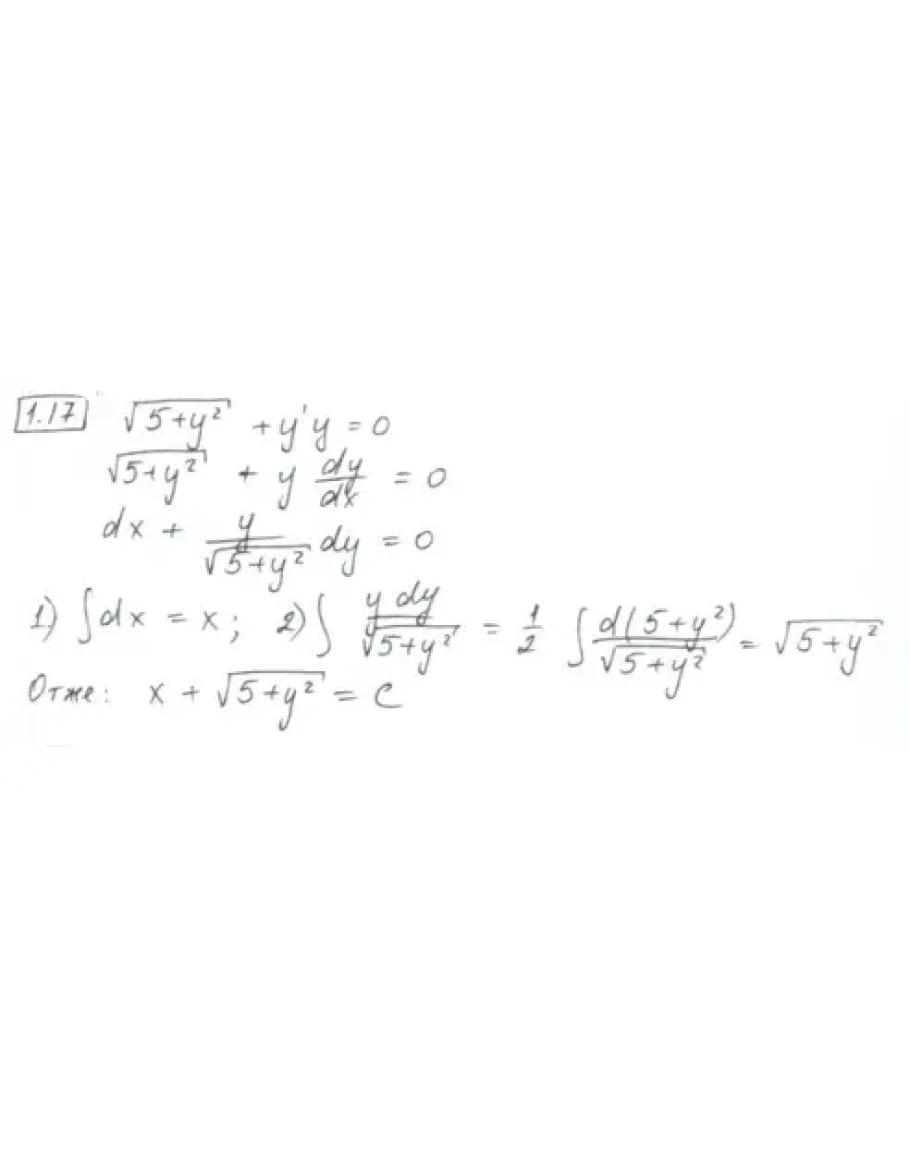 Розв'язана розрахункова робота з диференціальних рівнянь. НУЛП. В першому завданні потрібно знайти загальний інтеграл рівняння, в 15 - розв'язати задачу Коші. Варіант 17.