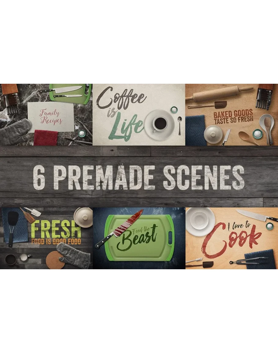 This scene creator includes 6 premade PSD scenes and 52 high-resolution photos, making it easy to create kitchen themed header and hero images, mockups, or other graphics with ease.