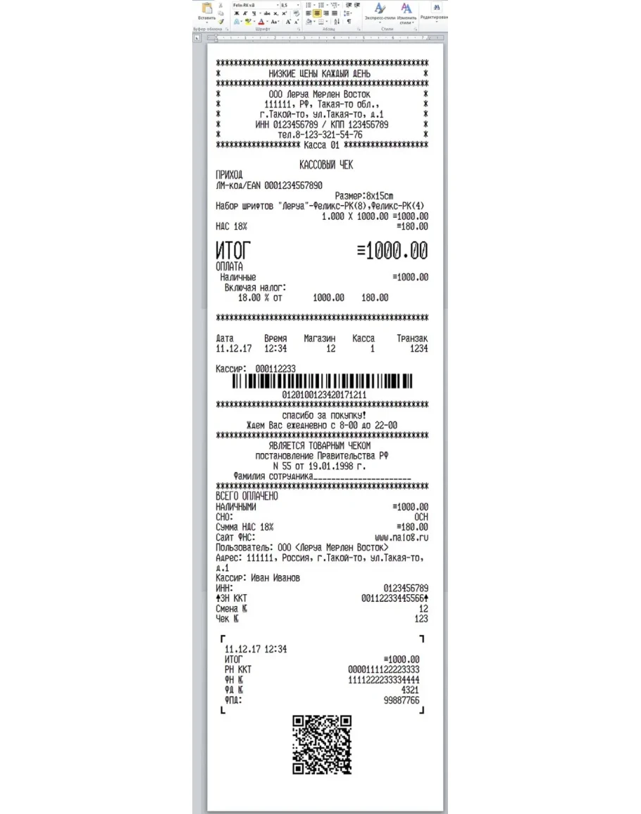 Данный набор шрифтов "ЛЕРУА МЕРЛЕН" кассового аппарата ФЕЛИКС-РК содержит 2 версии шрифтов (4 и8) в формате TTF (русские и английские буквы) для использования в программе Microsoft Word. В архиве находятся стандартные и широкие шрифты для каждой версии (всего 4 шрифта) в формате TTF и шаблон варианта чека, который, в частности, используется в сети магазинов ЛЕРУА МЕРЛЕН. Данный набор может не подойти конкретно для Вашего случая, так как в разных магазинах могут использоваться разные аппараты. Внимательно ознакомьтесь со скриншотами перед покупкой. Вам остается только установить шрифты в систему (обычно C:\WINDOWS\Fonts), открыть шаблон и начать редактирование. Печатать чеки предпочтительно на термопринтере, на кассовой термоленте. Хотя можно печатать и на струйнике и лазерном, с возможностью вывода на факсовую бумагу. Лучшее качество, естественно, при печати на термопринтерах.