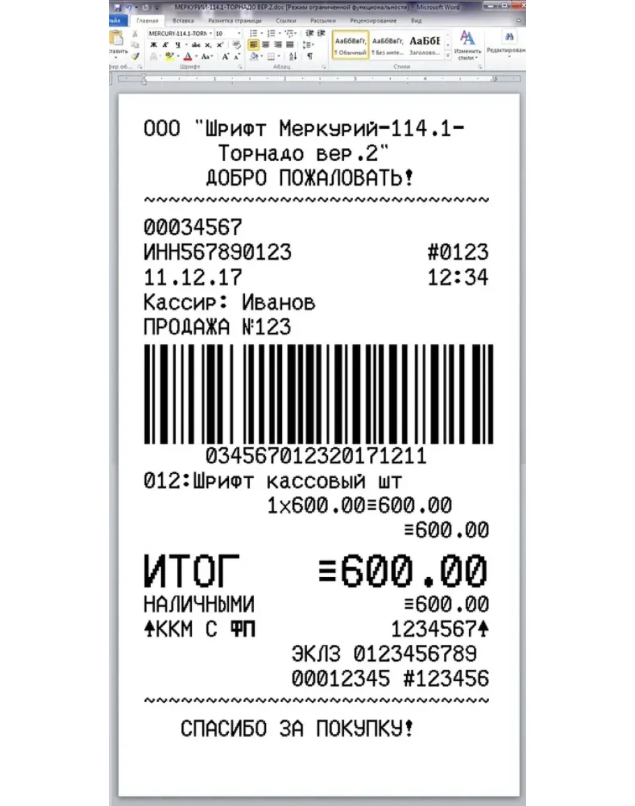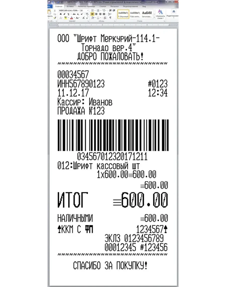 Данный полный набор шрифтов кассового аппарата МЕРКУРИЙ-114.1-ТОРНАДО содержит 4 версии шрифтов в формате TTF (русские и английские буквы) для использования в программе Microsoft Word. В архиве находятся шрифты в формате TTF и шаблоны вариантов чеков. Зачастую магазины используют в одном чеке несколько видов шрифтов с целью защиты чека от подделки. Данный набор позволит Вам повторить любой чек, напечатанный на данном аппарате. Вам остается только установить шрифты в систему (обычно C:\WINDOWS\Fonts), открыть шаблон и начать редактирование. Печатать чеки предпочтительно на термопринтере, на кассовой термоленте. Хотя можно печатать и на струйнике и лазерном, с возможностью вывода на факсовую бумагу. Лучшее качество, естественно, при печати на термопринтерах.