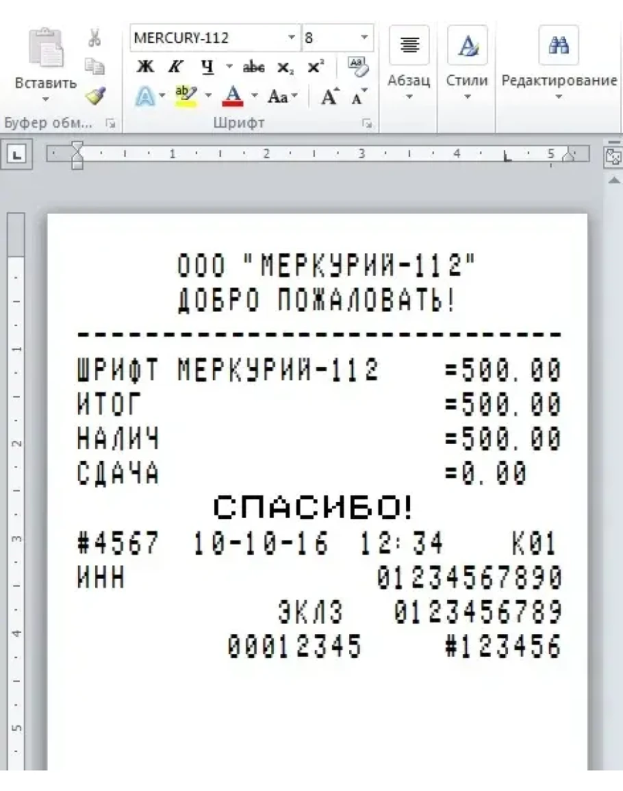 Шрифт кассового аппарата МЕРКУРИЙ-114.1-ТОРНАДО (Версия матрицы 16х10) в формате TTF (русские и английские буквы) для использования в программе Microsoft Word. В архиве находятся обычный и жирный шрифты в формате TTF и шаблон чека. Вам остается только установить шрифт в систему (обычно C:\WINDOWS\Fonts), открыть шаблон и начать редактирование. Печатать чеки предпочтительно на термопринтере, на кассовой термоленте. Хотя можно печатать и на струйнике и лазерном, с возможностью вывода на факсовую бумагу. Лучшее качество, естественно, при печати на термопринтерах.
