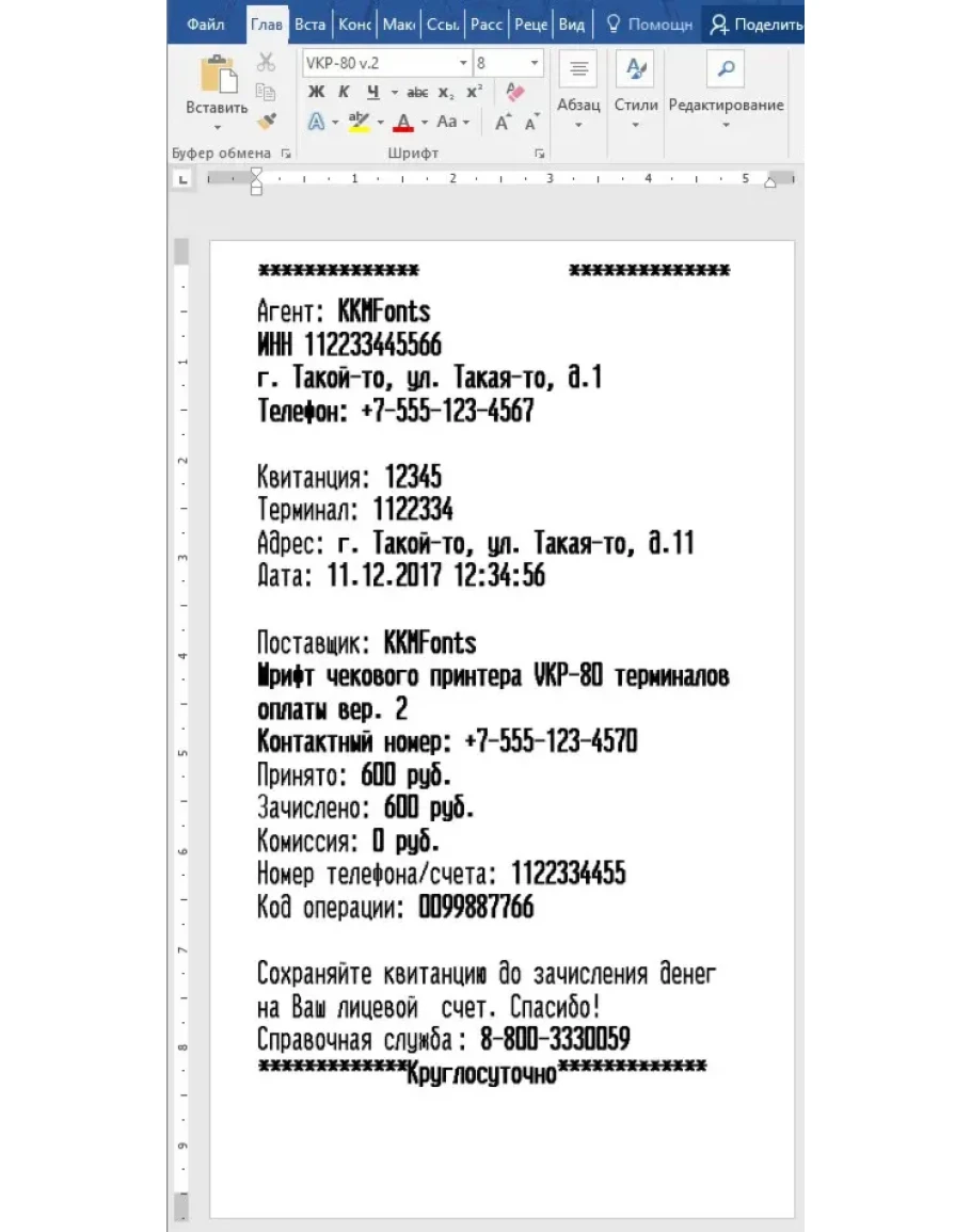 Шрифт чекового принтера VKP-80(версия 2), который устанавливается во многие терминалы оплаты в формате TTF (русские и английские буквы) для использования в программе Microsoft Word. В архиве находятся шрифт в формате TTF и шаблон чека. Вам остается только установить шрифт в систему (обычно C:\WINDOWS\Fonts), открыть шаблон и начать редактирование.