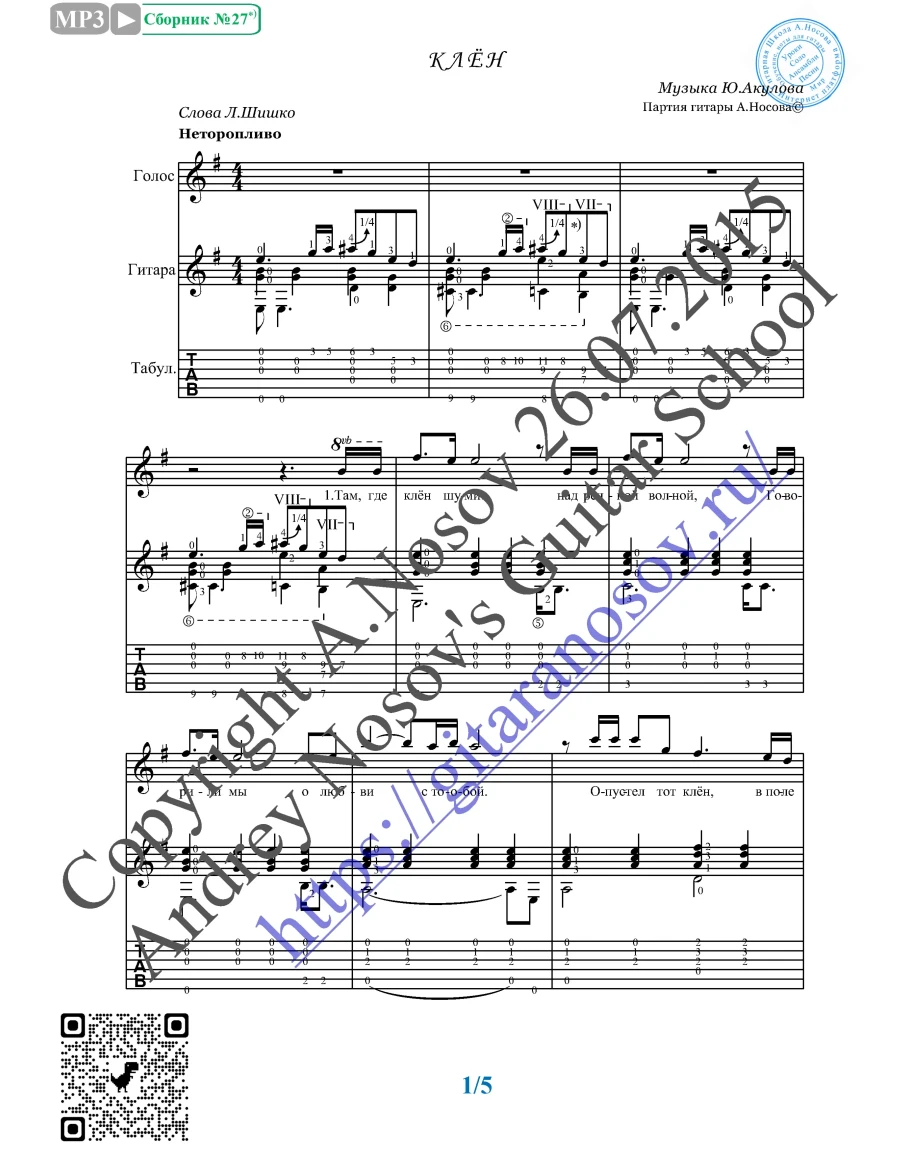 Кликните "Подробнее" для получения дополнительной информацииВашему вниманию предлагается композиция "Клён (муз.Ю.Акулова, сл.Л.Шишко)", предназначенная для вокала в сопровождении 6-ти струнной гитары (pdf / png*). Запись выполнена нотами и включает в себя партию вокала с подтекстовкой, партию гитары с подробнейшей аппликатурой, текст песни (НА РУССКОМ ЯЗЫКЕ). Партия гитары продублирована табулатурой. Прилагается ссылка на скачивание mp3.
