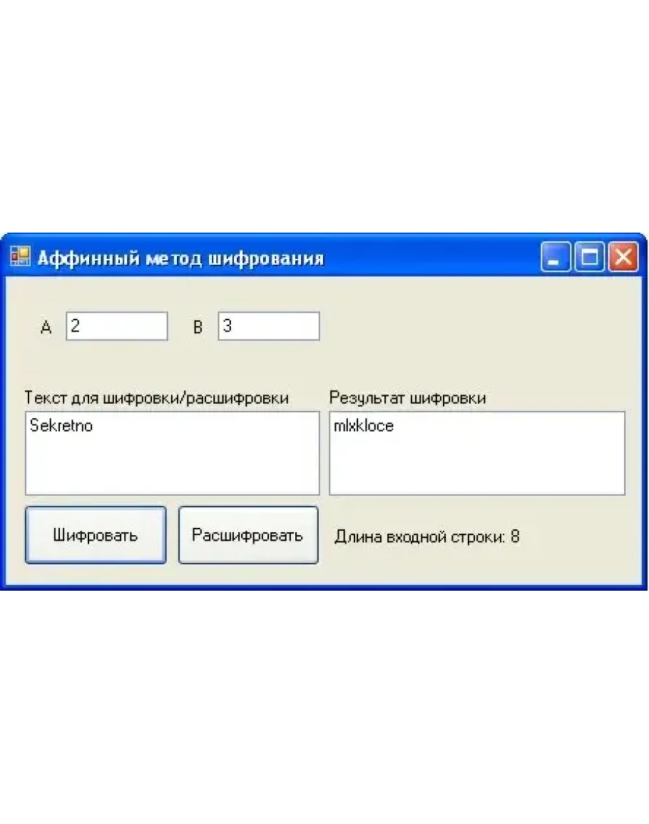 1) Приведена реализация программы шифровки и расшифровки аффинным шифром на языке C#;