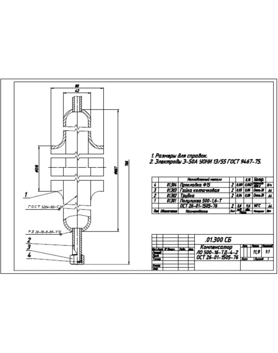 Чертеж компенсатора ЛО 500-16-ТД-4-2 ОСТ 26-01-1505-76. Сборочный чертеж, чертежи деталей. Формат DWG.