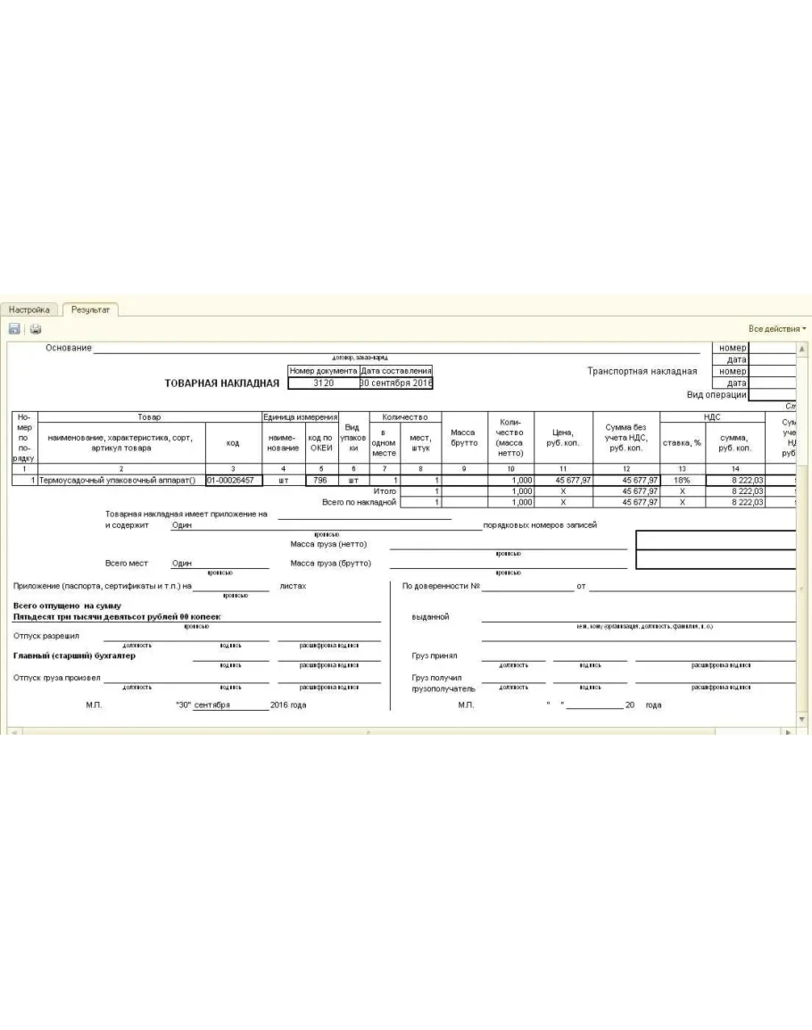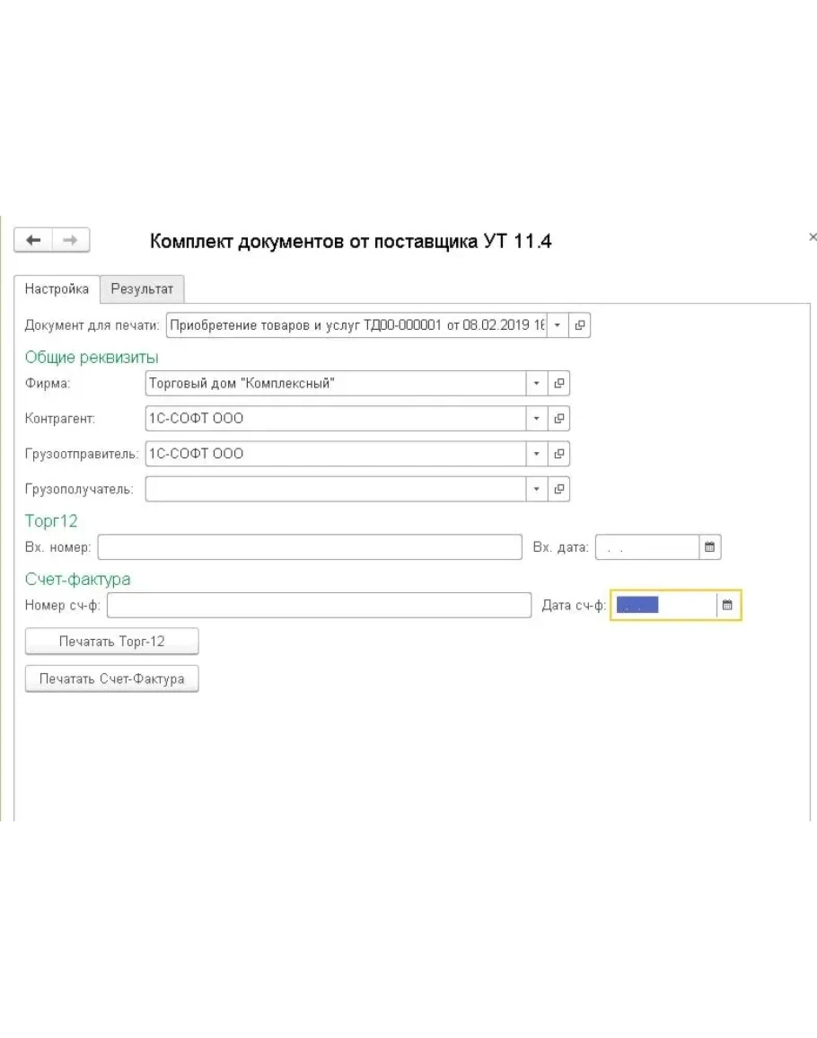 Позволяет печатать формы "Торг-12" и "Счет-фактура" с реквизитами документа поступления. Позволяет задавать Грузополучателя и Грузоотправителя произвольно. ФИО и должности уполномоченных лиц контрагента не печатаются.