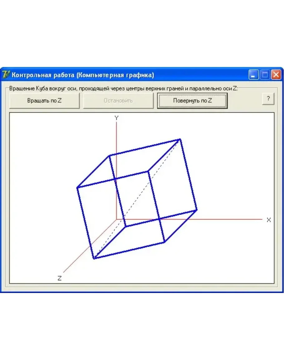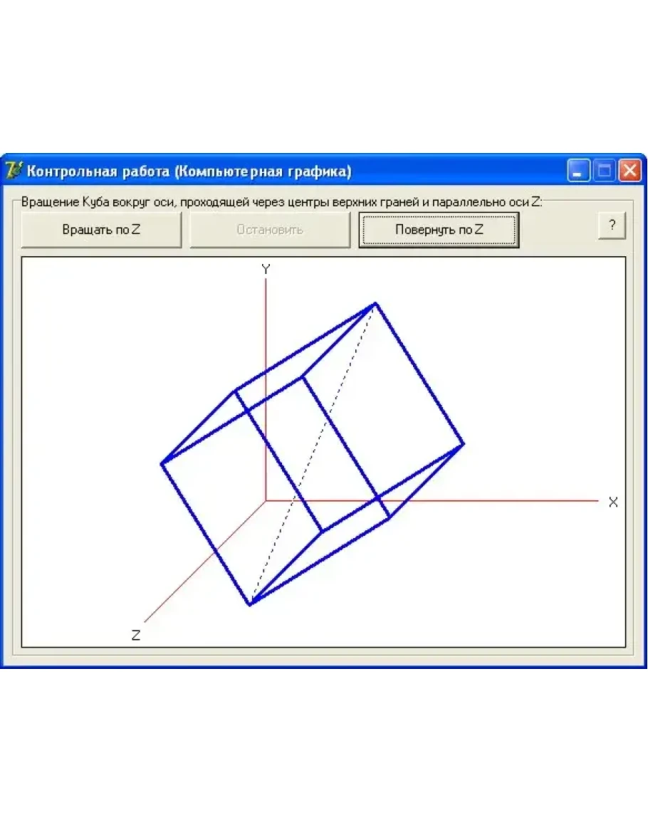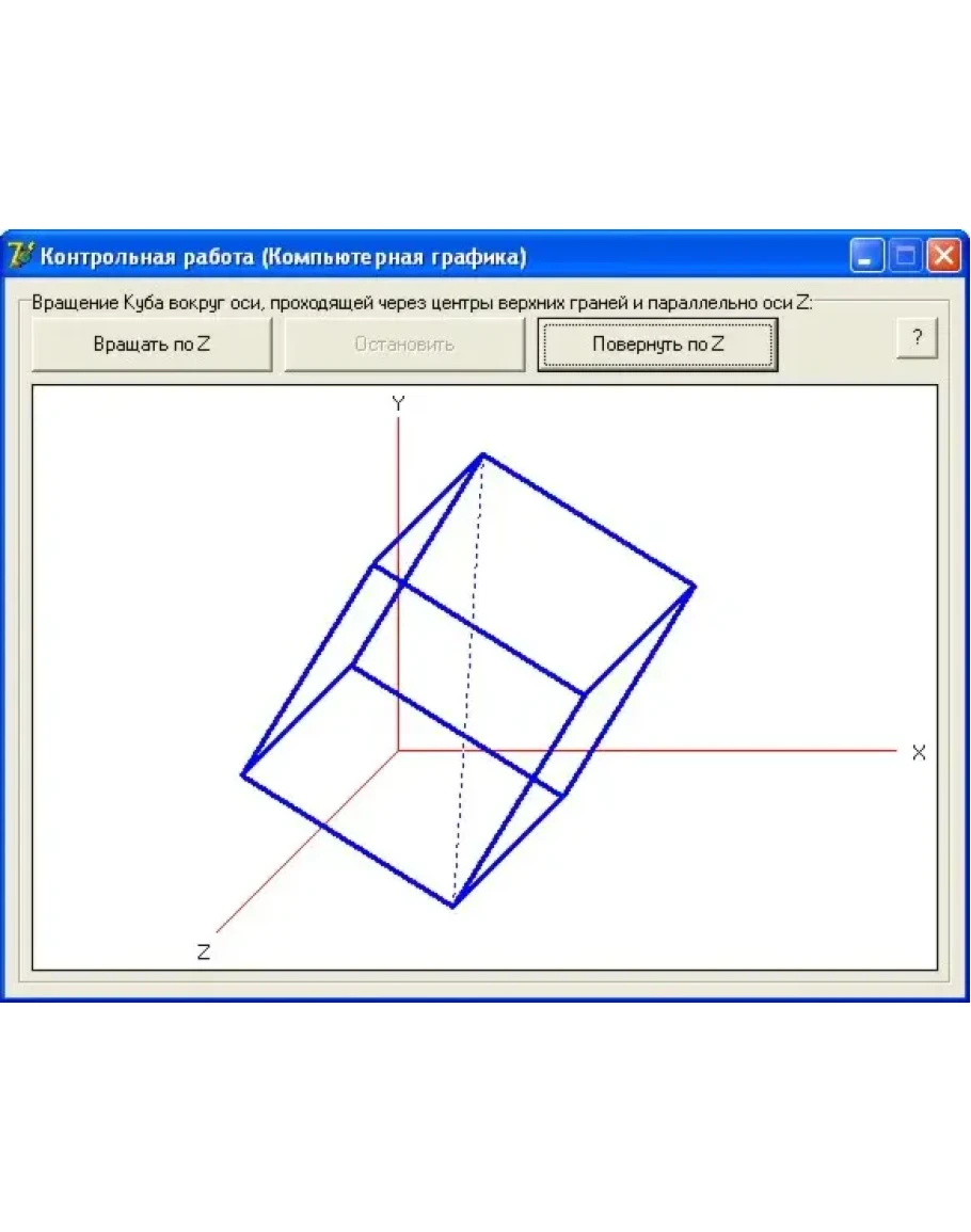 Вращение куба. Куб вращается вокруг оси, проходящей через центры верхних граней и параллельной оси Z. Вращение имитируется выводом изображения куба в разных положениях, отличающихся друг от друга на малый угол поворота. Использовать композицию матриц T, Rz, T-1, где T - матрица переноса центра куба в начало координат, Rz - матрица поворота вокруг оси Z, T-1 - перенос центра куба в исходное положение.