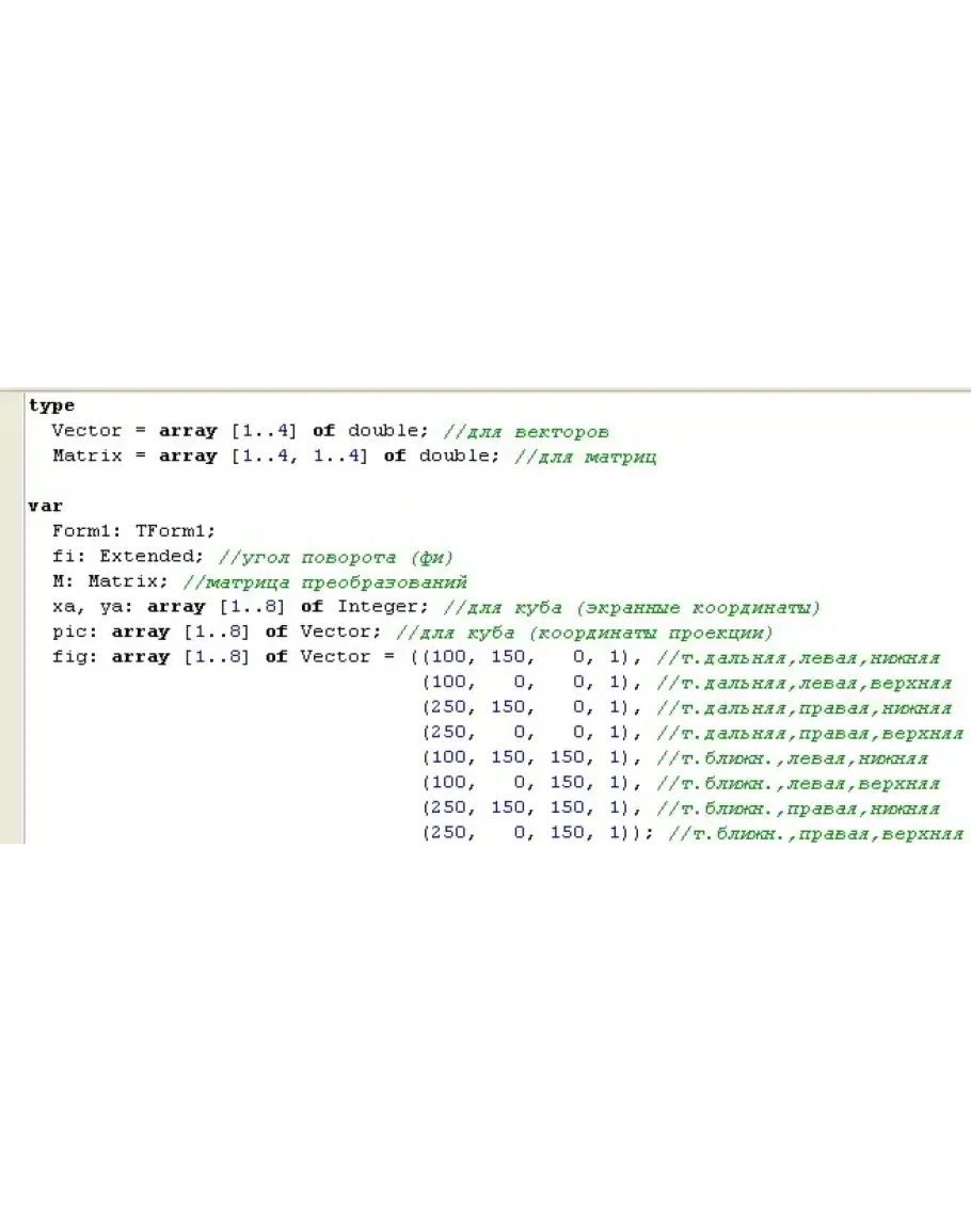 Тело представлять набором отрезков. Вращение тела реализуется умножением однородных координат его вершин на композицию матриц переноса и поворота. После этого переходят к видовой системе координат и производят проецирование. Координаты проекции преобразуются в экранные координаты, и изображение выводится на экран. Проецирование осуществляется умножением векторов координат концов отрезков на матрицу проецирования. Вычисленные координаты преобразуются в экранные координаты xa, ya. Включить в программу типы Vector, Matrix и процедуры умножения вектора на матрицу и матрицы на матрицу. Перерисовку изображения производить в обработчике onTimer. Для вывода изображения использовать методы MoveTo, LineTo и другие класса Canvas.