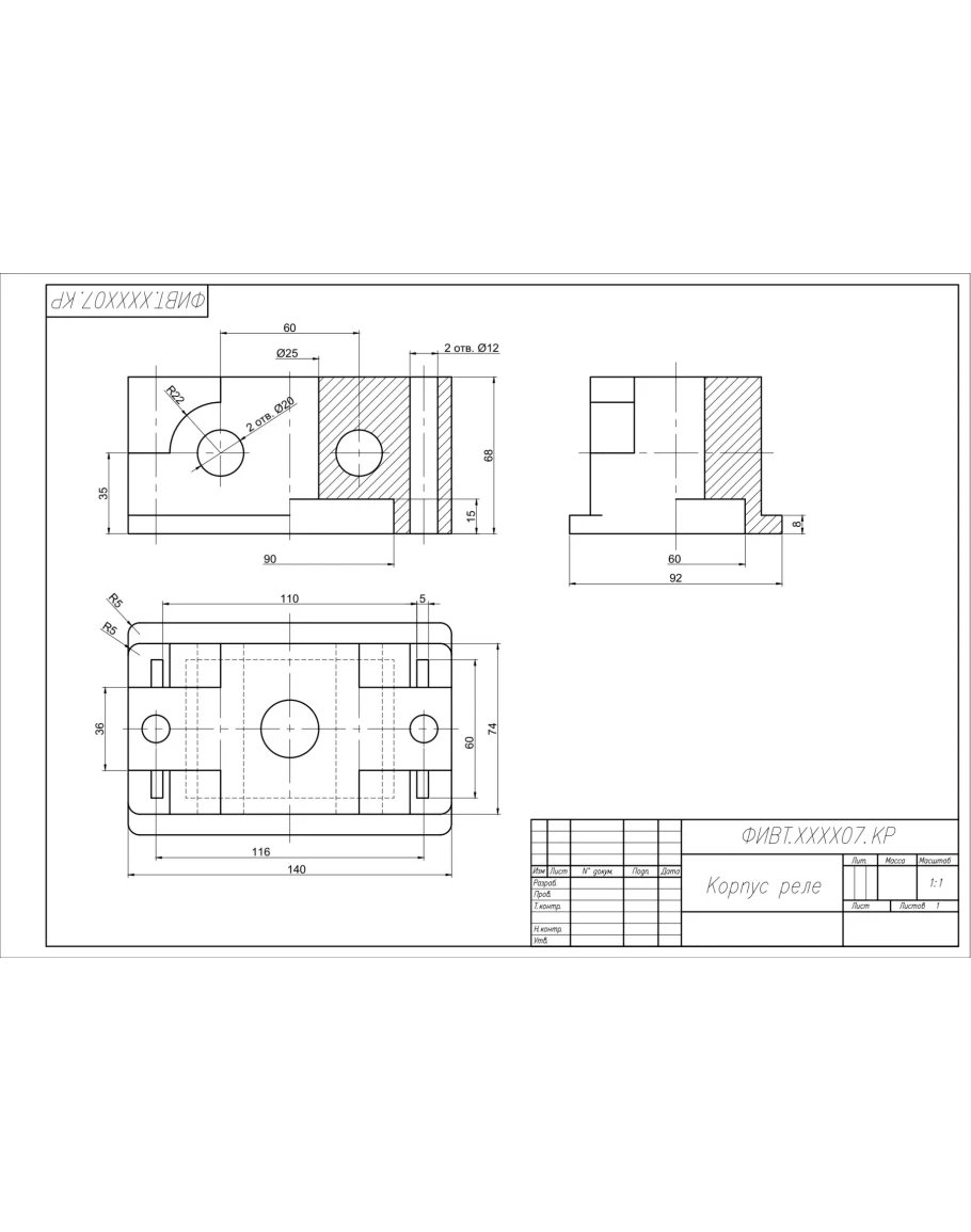 Чертеж детали корпус реле в программе AutoCAD. Также приложена 3D модель детали, которая выполнена в программе Компас 3D