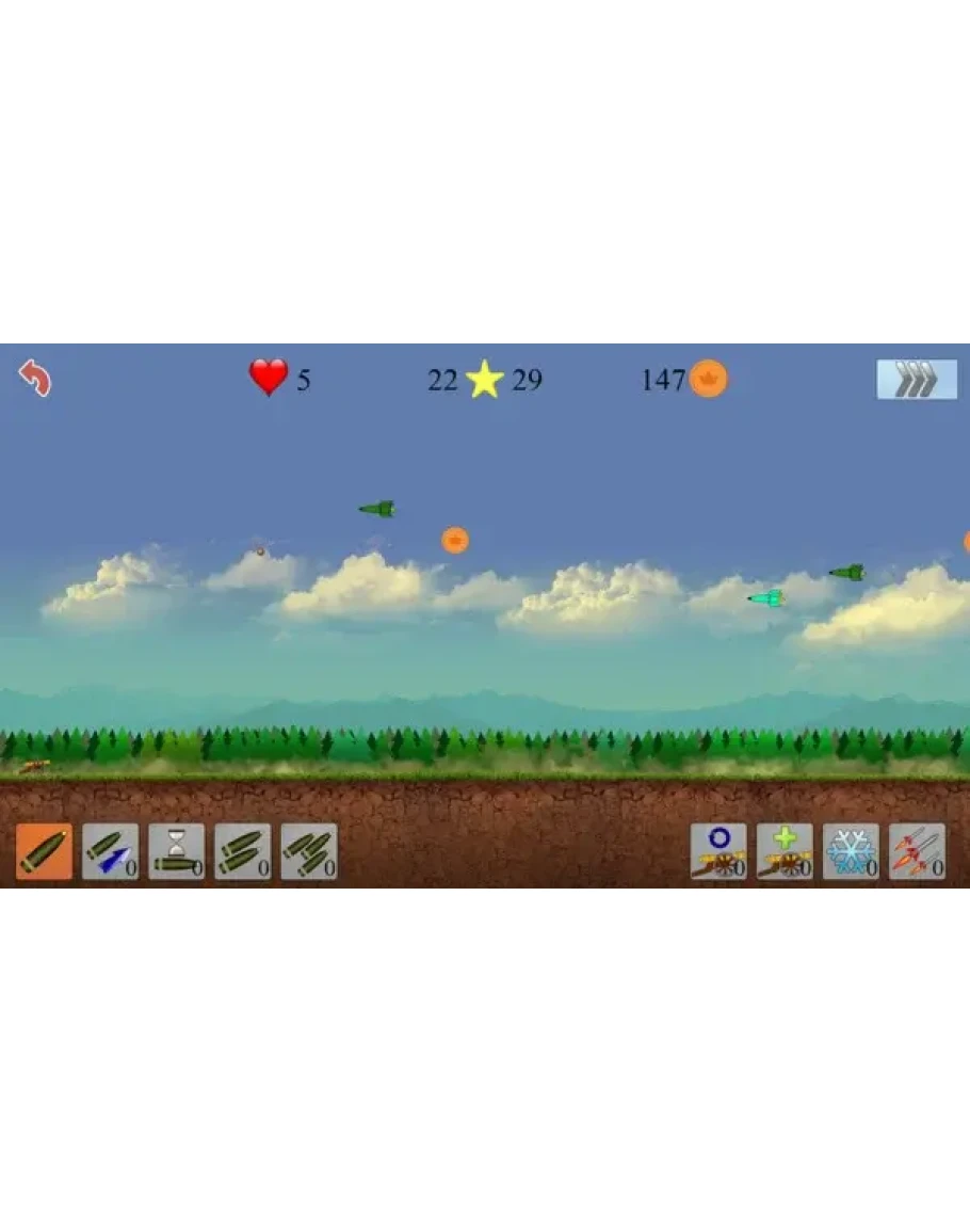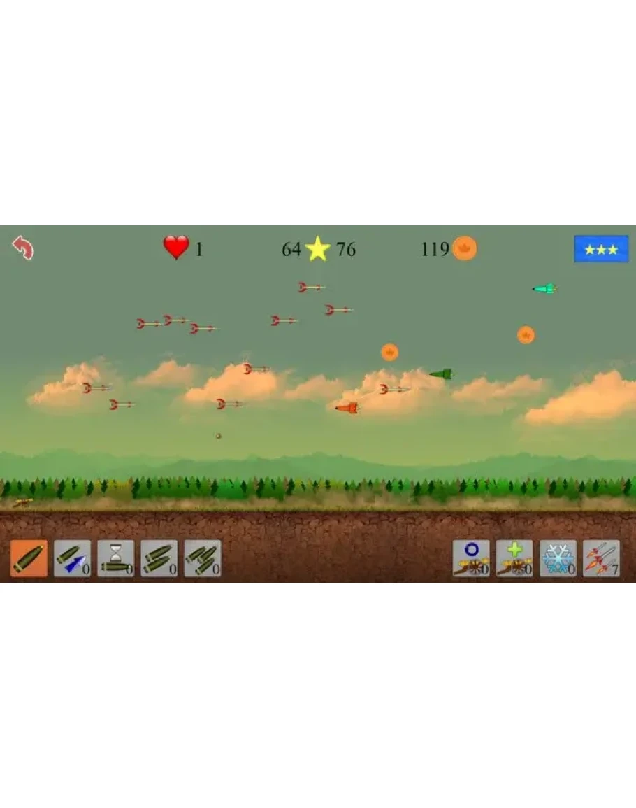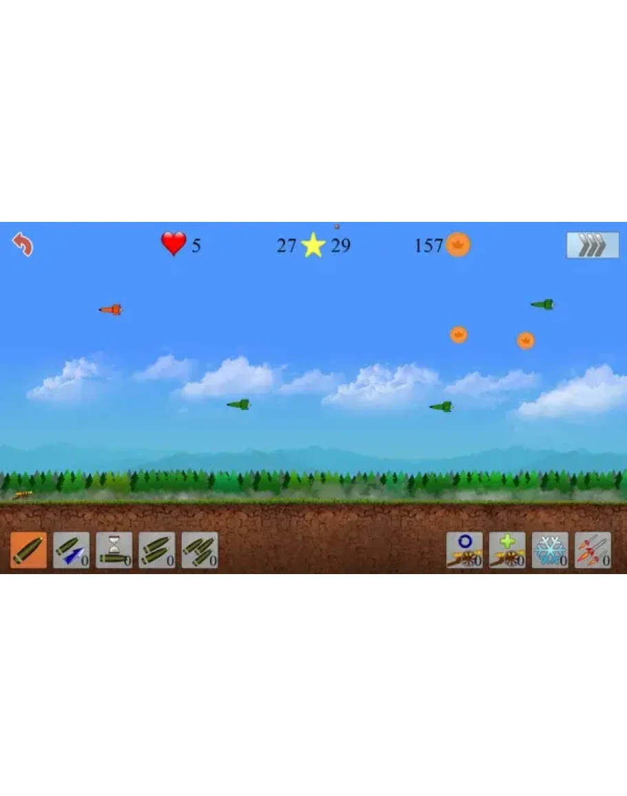 The game is not simple. You must aim and shoot not at the missile, but at a point further along its tracking route. Air targets are usually very high. While your projectile will fly to intercept the enemy target, a certain amount of time will pass. During this time, the enemy will fly some more distance. You must fire at this distance for your projectile to collide with the enemy missile. Remember that your weapon reloads. This is not an machine gun that can fire bursts. Therefore, each shot must be clearly on target.