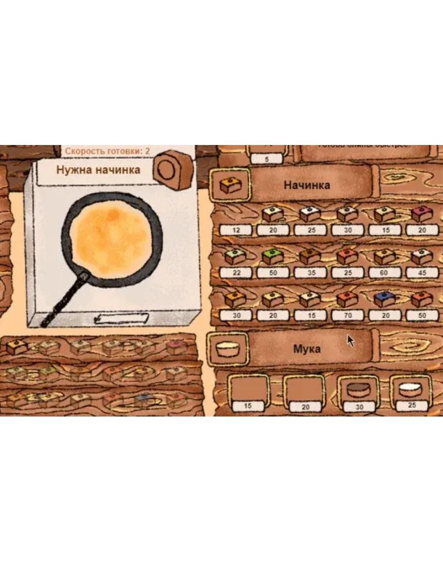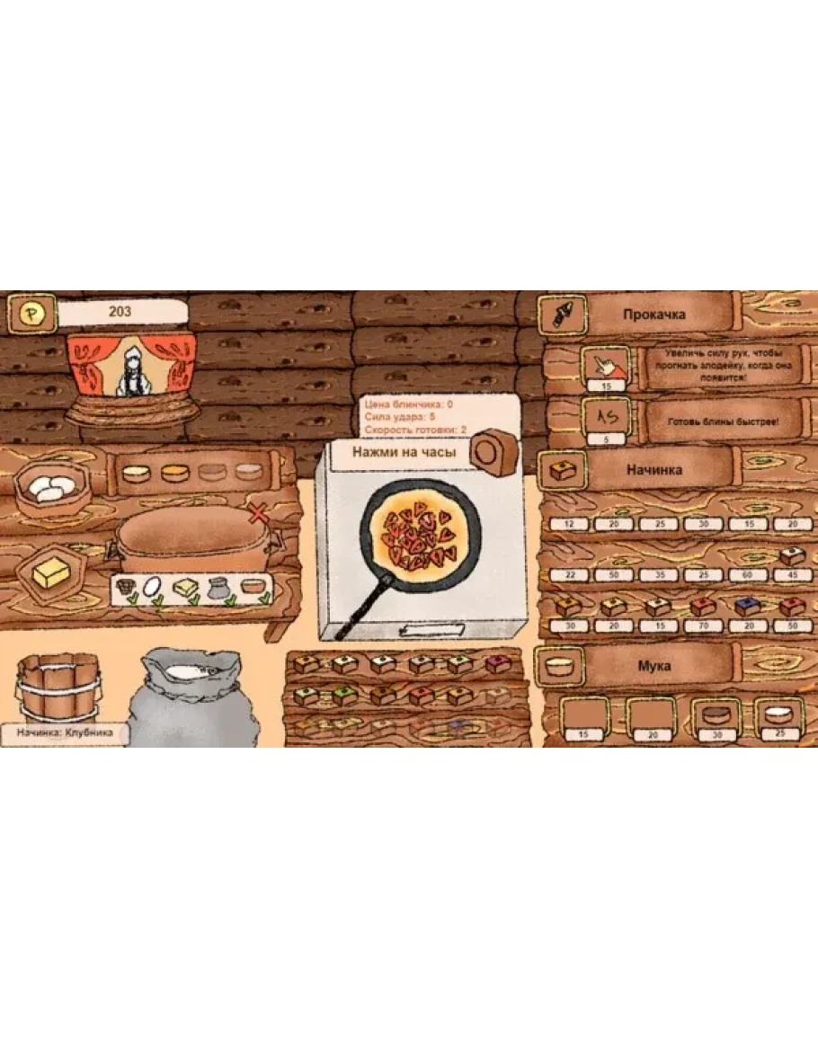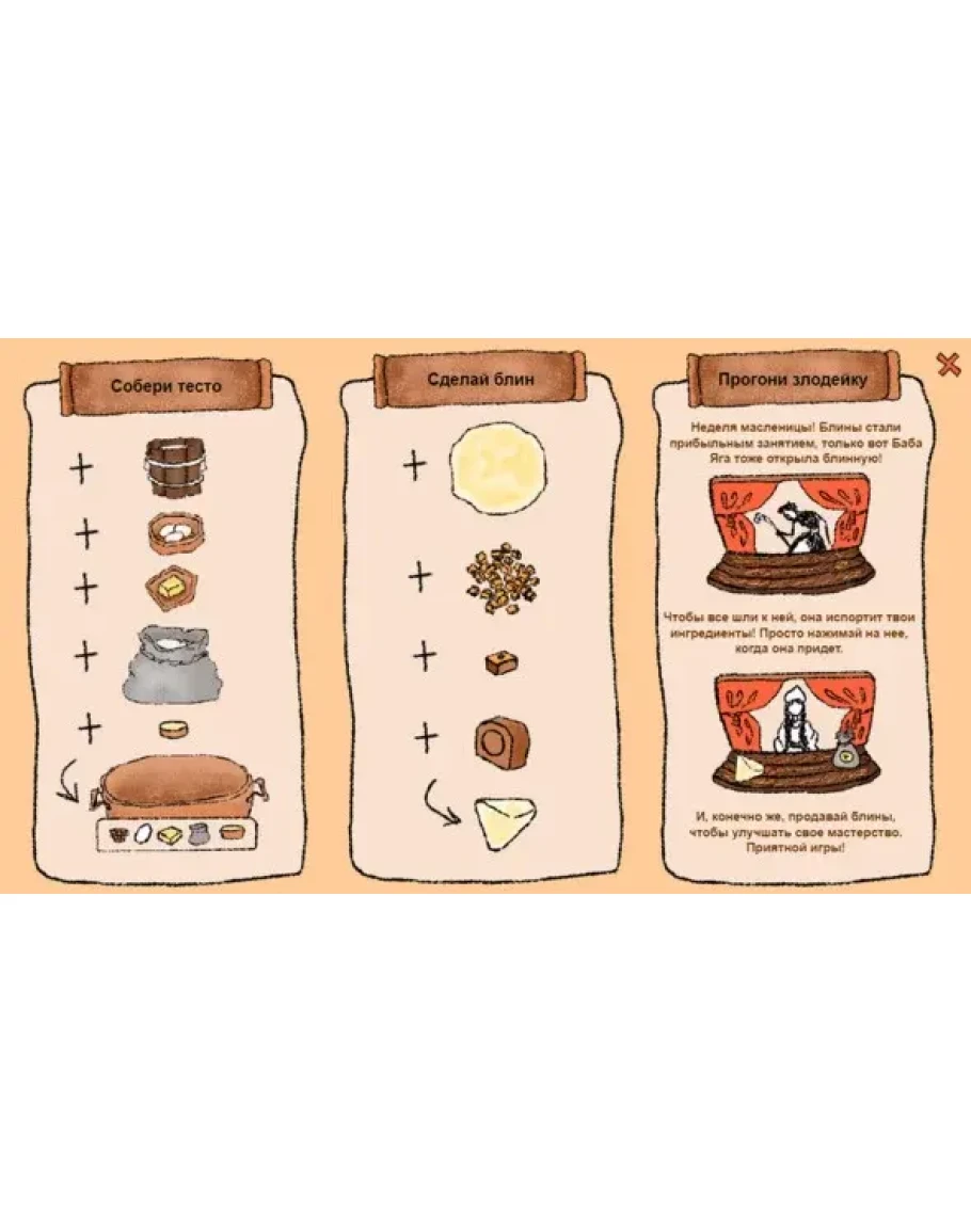 Game - clicker, you have to assemble a pancake in a pan from different ingredients and by clicking on the filling add it to the pancake. Drag and drop items into the pan, sell pancakes, unlock new ingredients, different batter, enhancements. Don't let Baba Yegi ruin Pancake Week