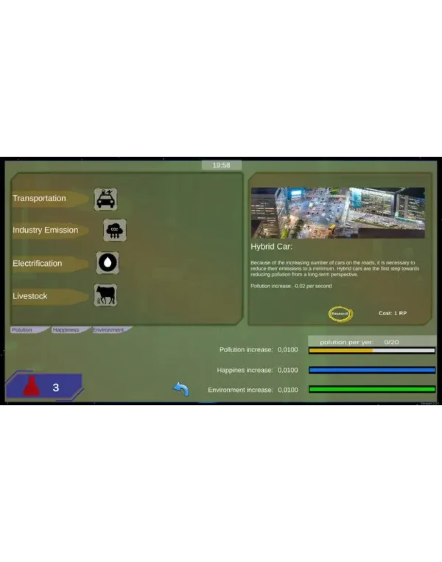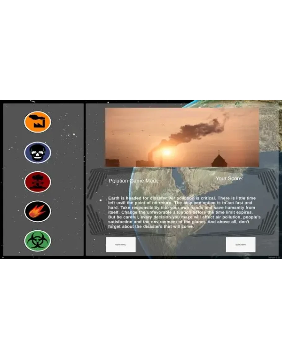 Disaster game is a combination of strategy and simulator. Your task in the game is to collect a sufficient amount of research points that appear on the map and use them to unlock the appropriate regulations thanks to which you will avert the impending disaster. Each regulation affects several things at the same time, so you have to balance people's satisfaction, environmentalism and disaster prevention.