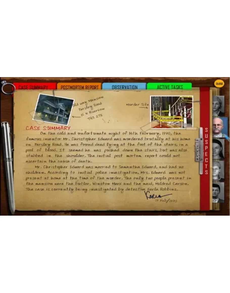 Famous inventor Mr Christopher Edward has been brutally murdered in his home! Step into the shoes of detective Karla Robbins in this elaborate murder investigation to seek out the real culprit.