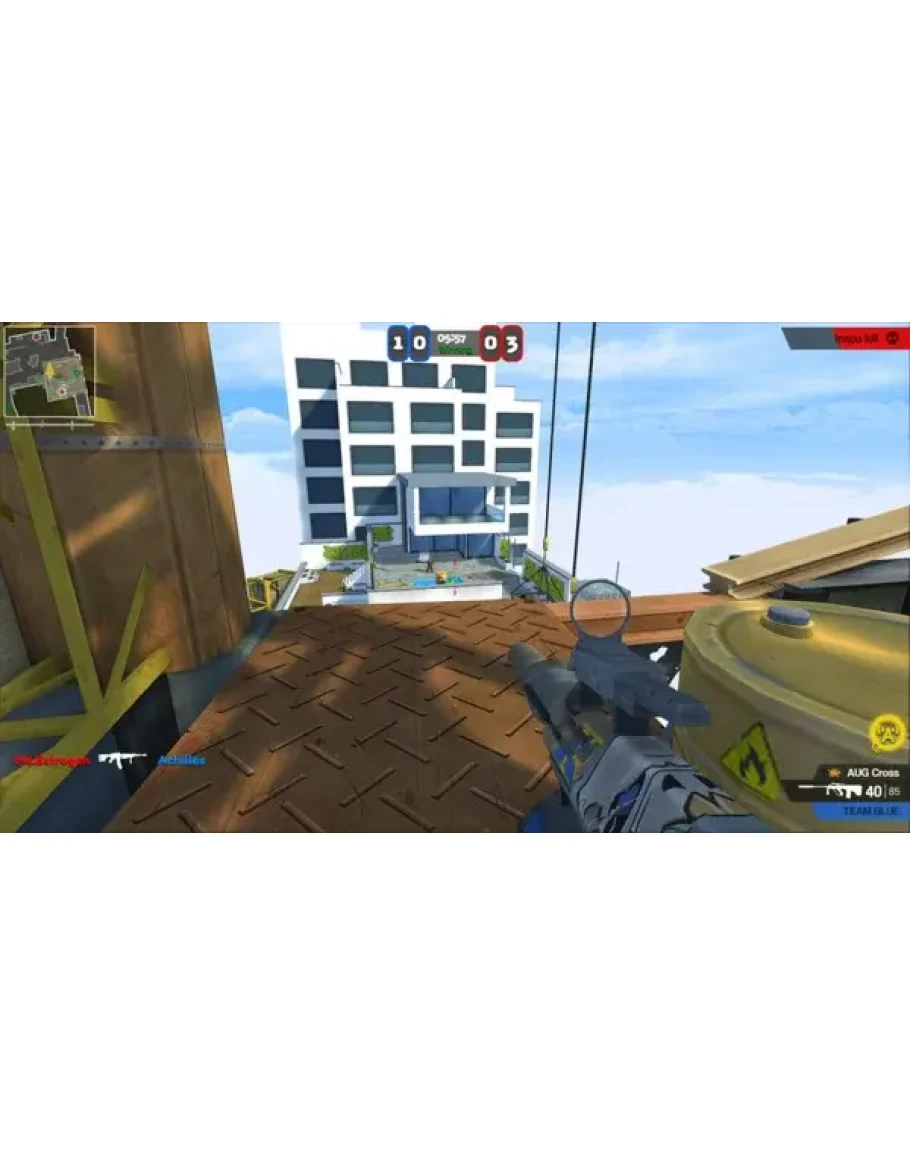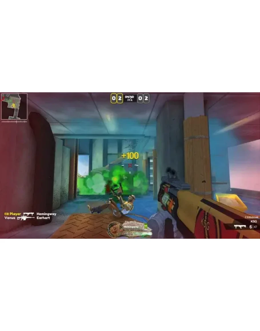 False Front is a cartoony first-person shooter set in a huge sports arena. Dominate the spotlight with powerups, using the speed and momentum from bouncing on trampolines.