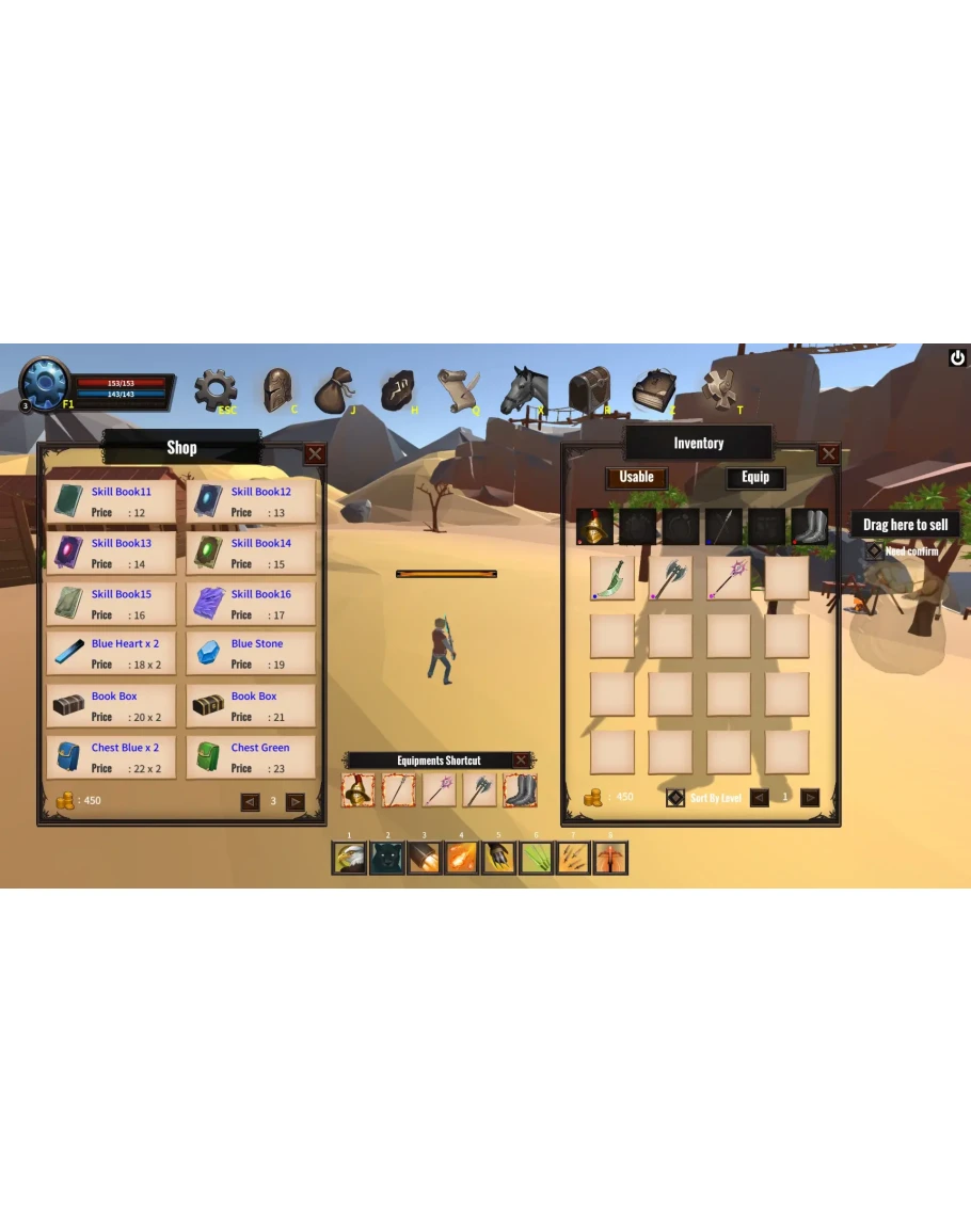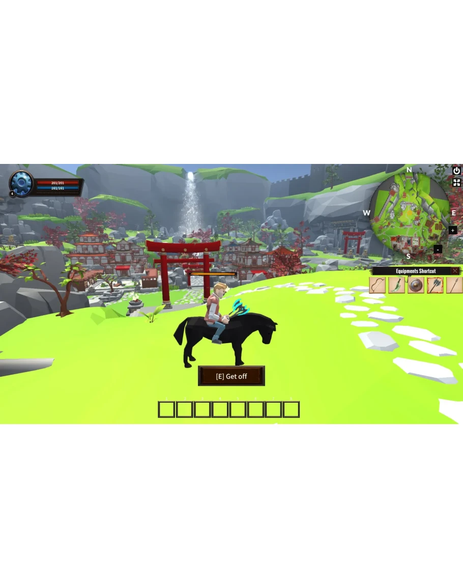 Sword, axe, dagger, shield, bow, spear, staff and other weapon types, each weapon has a different attack mode. There are many other equipments in the game too .And there are also quest, shop ,inventory, treasure chests, skills, pets, craft, mount and other systems.