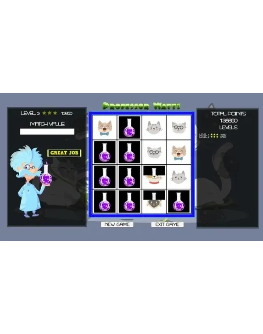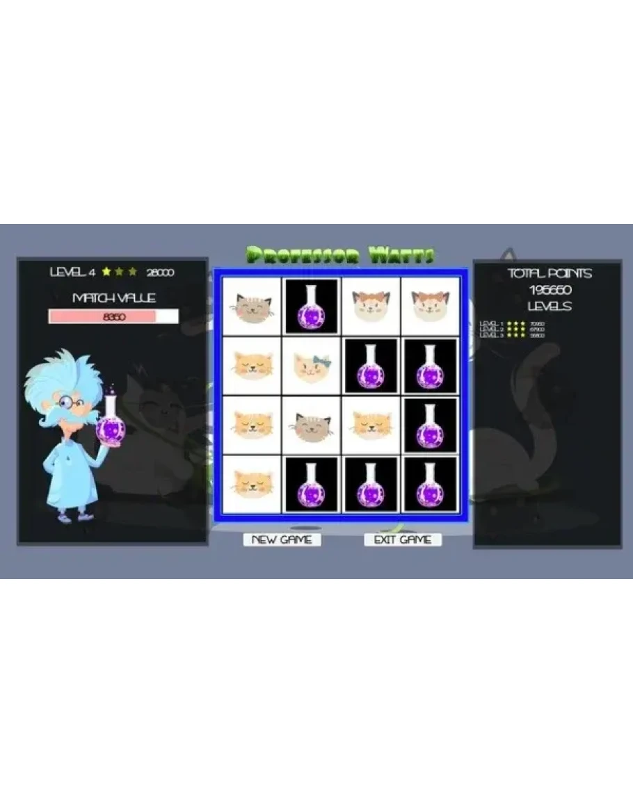Hello Professor Watts here and I have some research to do on memory skills. I have assembled a wide variety of cats to put our memory to the test. We can see how we're doing by completing matches in a specific amount of time and earning points to track our overall progress.