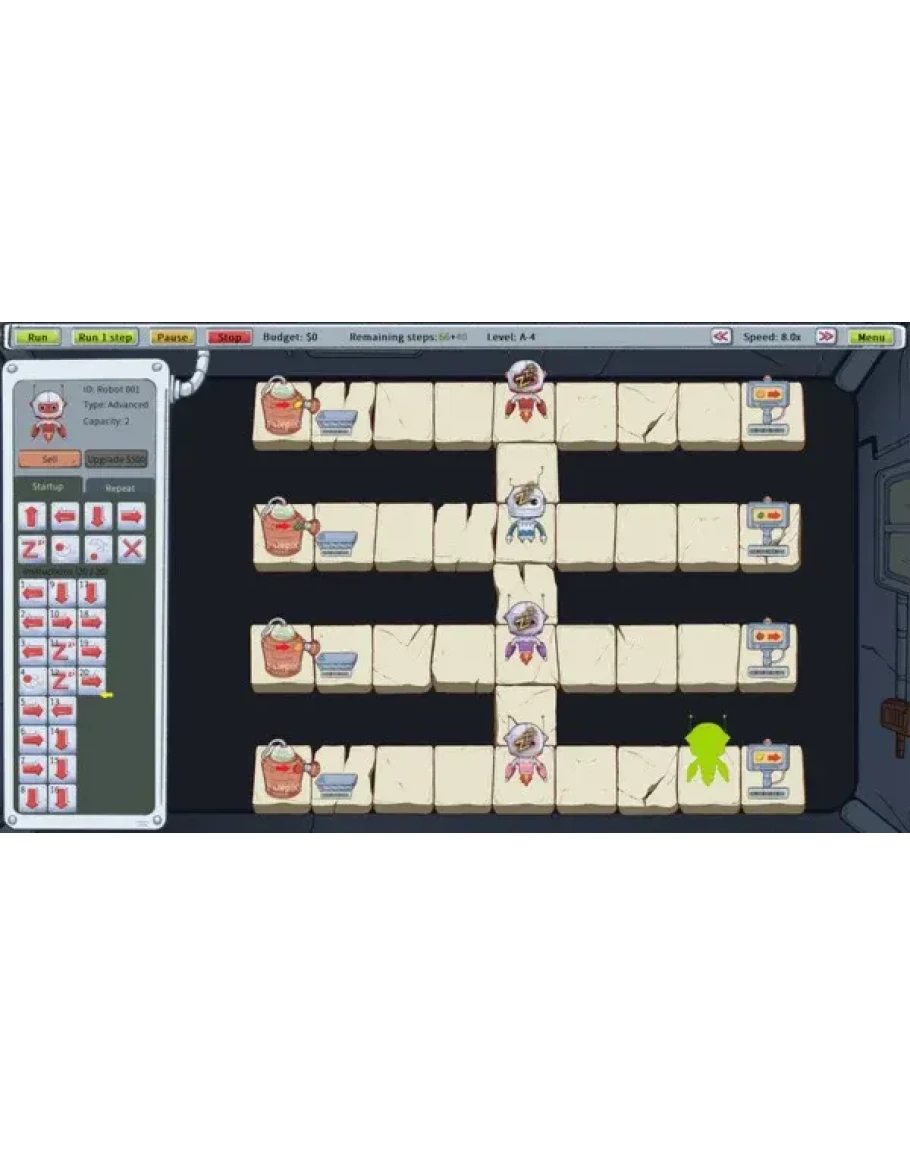 Programming - Code the robots with simple instructions to move materials and products. Besides producing the correct output, you need to coordinate the robots in a fast and efficient way.