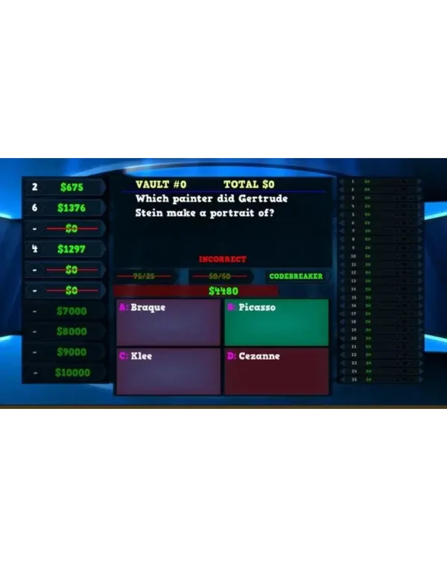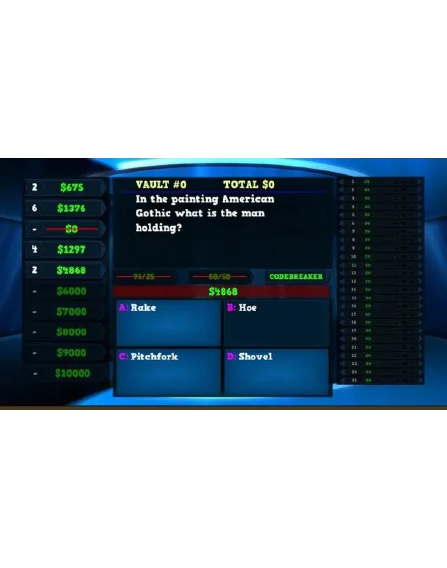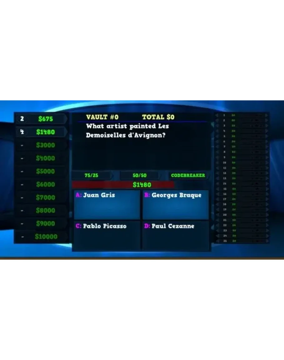 Welcome to the Trivia Vault contestant! Play as a contestant in a gameshow called Trivia Vault Art Trivia and bring your thinking hat. Answer art trivia questions as quickly as you can, the faster you answer the higher the cash value.