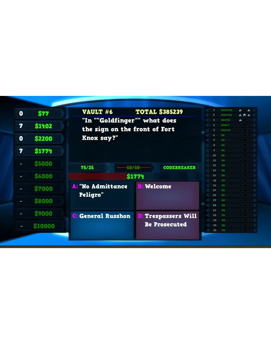 Welcome to the Trivia Vault contestant! Play as a contestant in a gameshow called Trivia Vault Movie Trivia and bring your thinking hat. Answer movie trivia questions as quickly as you can, the faster you answer the higher the cash value.