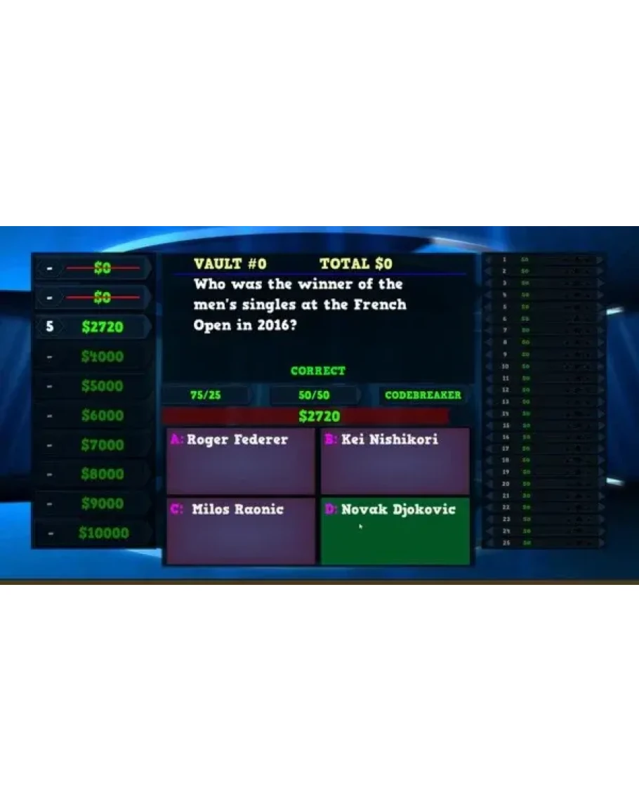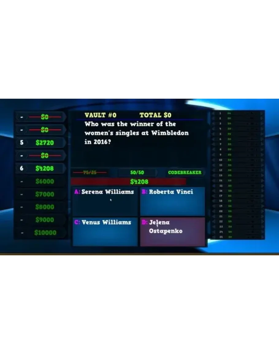 Welcome to the Trivia Vault contestant! Play as a contestant in a gameshow called Trivia Vault Tennis Trivia and bring your thinking hat. Answer tennis trivia questions as quickly as you can, the faster you answer the higher the cash value.