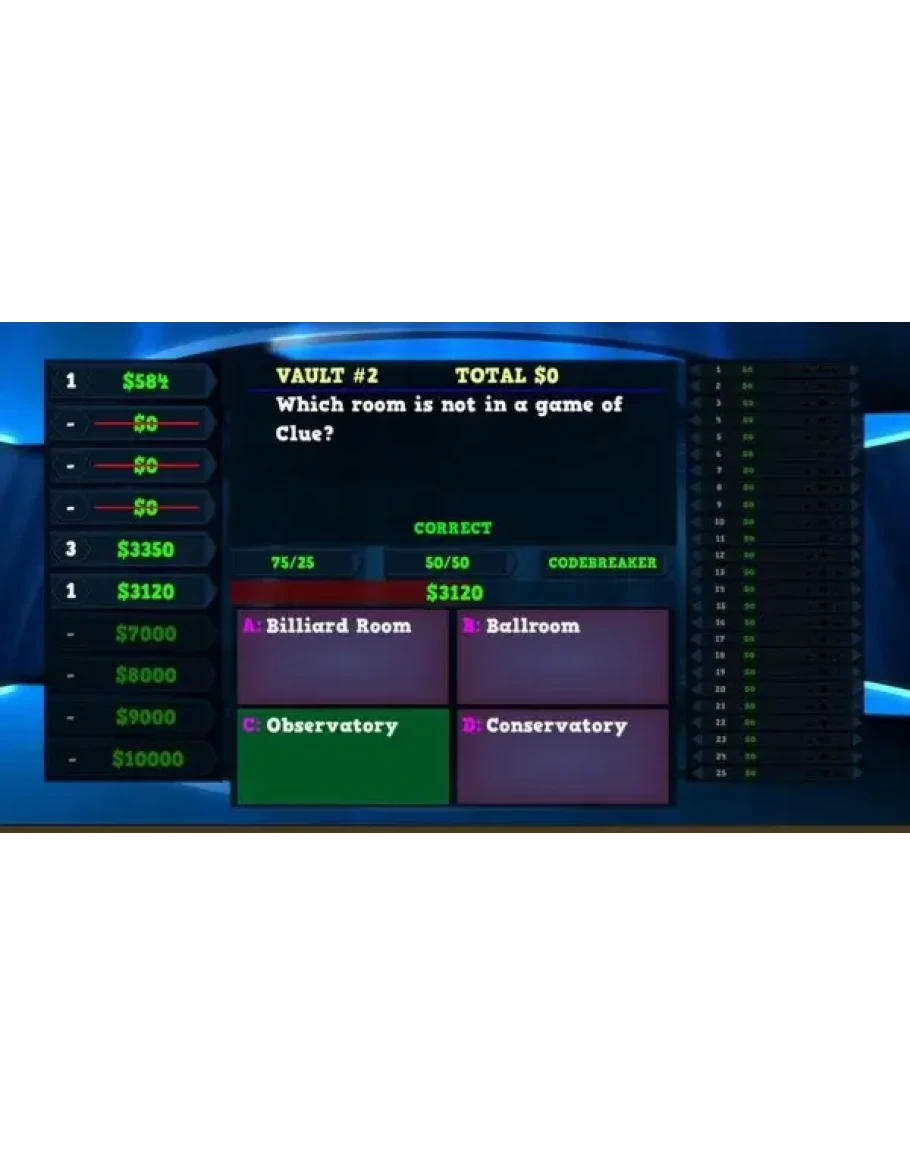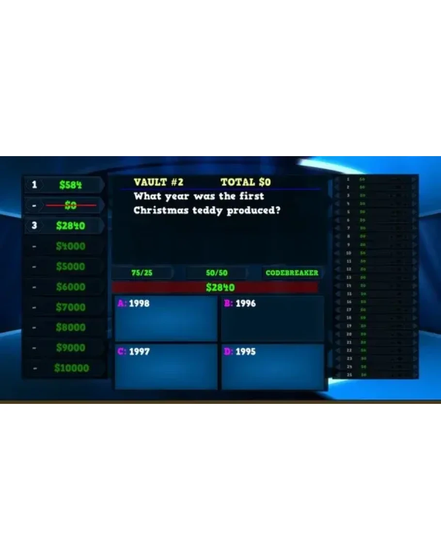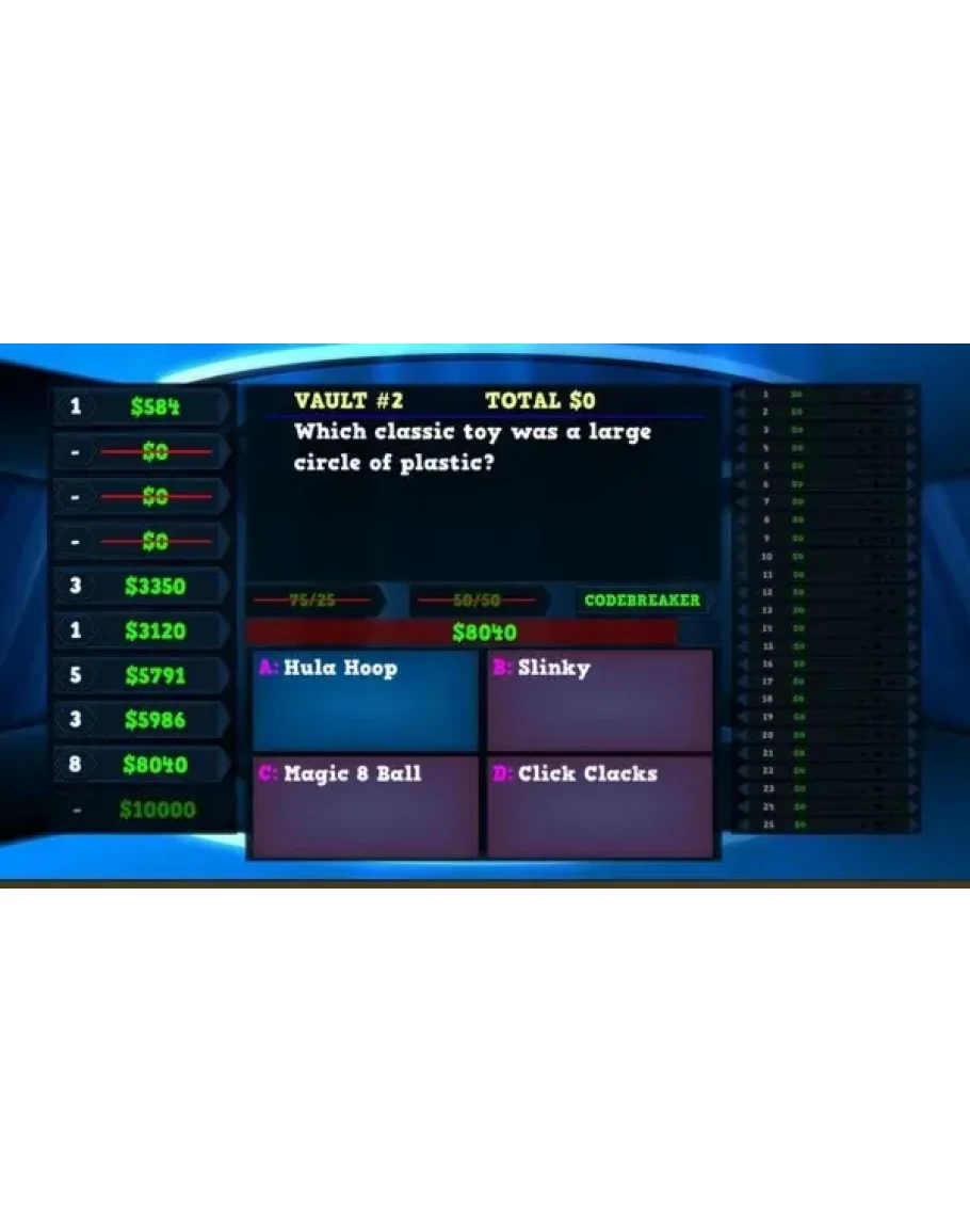 Welcome to the Trivia Vault contestant! Play as a contestant in a gameshow called Trivia Vault Toy Trivia and bring your thinking hat. Answer toy trivia questions as quickly as you can, the faster you answer the higher the cash value.