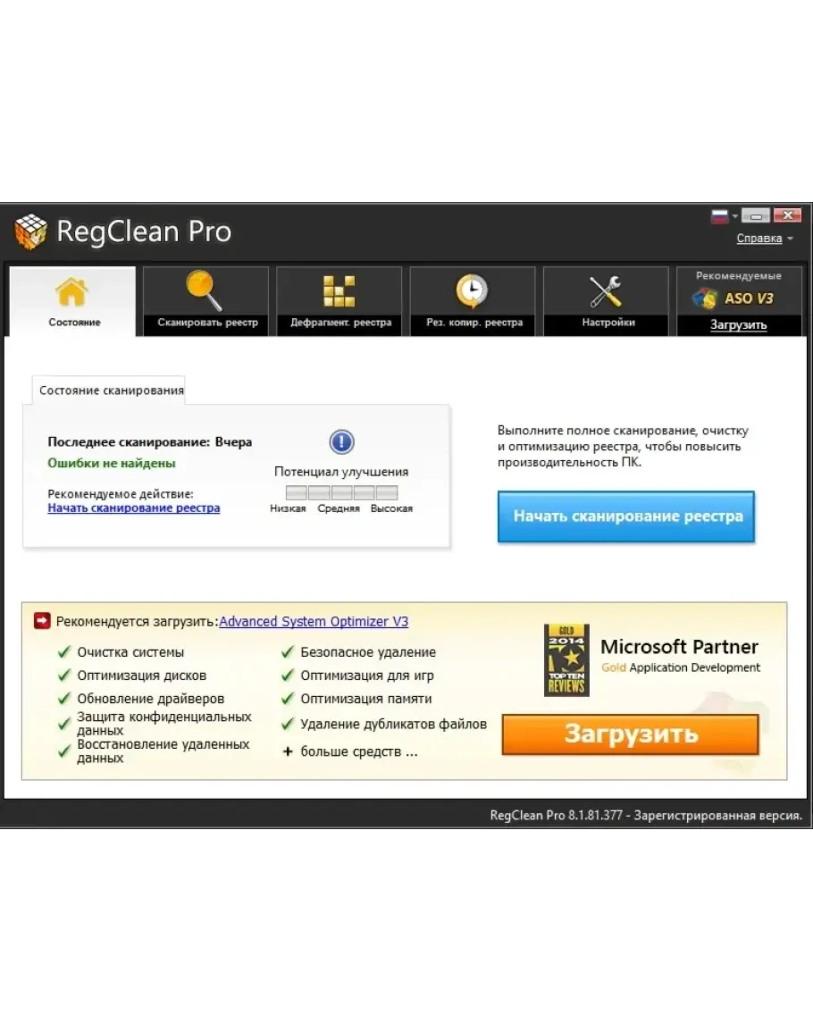 Программа не только находит ошибки в реестре, но и поддерживает его в актуальном состоянии. Вам не нужно быть компьютерным экспертом чтобы использовать эту утилиту. RegClean Pro позволяет исправить все ошибки реестра легко и быстро, даже для начинающих пользователей, а так же обеспечивает полное резервное копирование реестра для отмены изменений