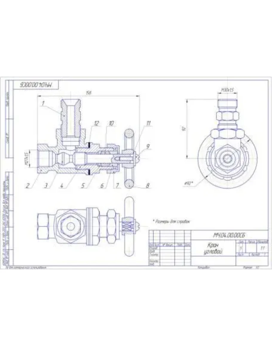Сборочный чертеж углового крана, без деталировки. Сделан в компасе 14+ сохранен в виде картинки