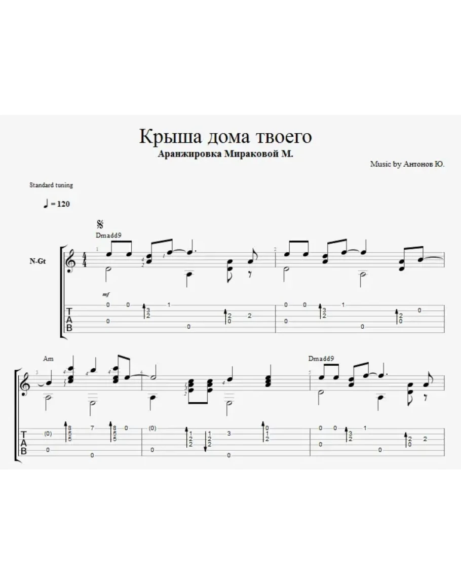 Авторская аранжировка для шестиструнной гитары от Марины Мираковой на композицию Юрия Антонова "Крыша дома твоего".