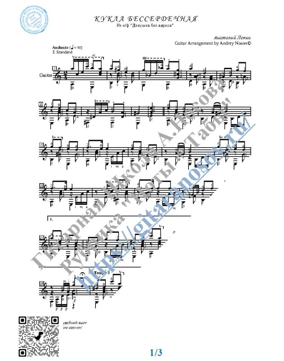 Кликните "Подробнее" для получения дополнительной информацииВашему вниманию предлагается популярная песня "Кукла бессердечная" (А.Лепин), из к/ф "Девушка без адреса", предназначенная для исполнения на 6-ти струнной гитаре СОЛО. Запись выполнена нотами, сопровождена подробнейшей аппликатурой и продублирована табулатурой. И ещё…