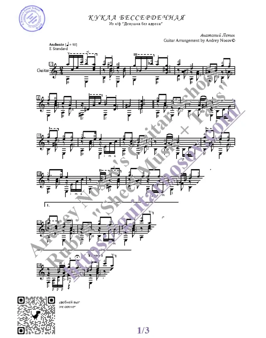 Кликните "Подробнее" для получения дополнительной информацииВашему вниманию предлагается композиция "Кукла бессердечная (А.Лепин)", предназначенная для исполнения на 6-ти струнной гитаре СОЛО. Запись выполнена нотами, сопровождена подробнейшей аппликатурой и продублирована табулатурой.