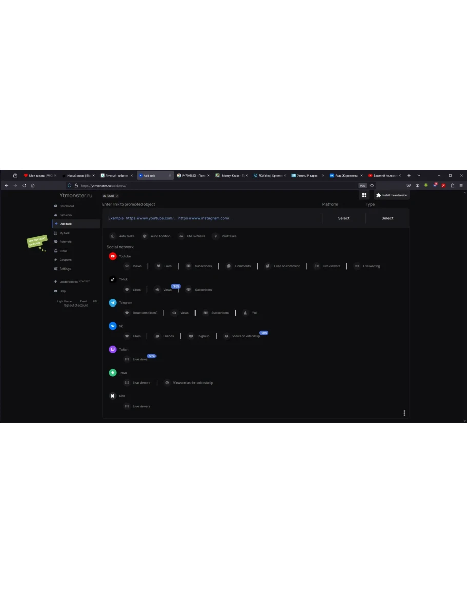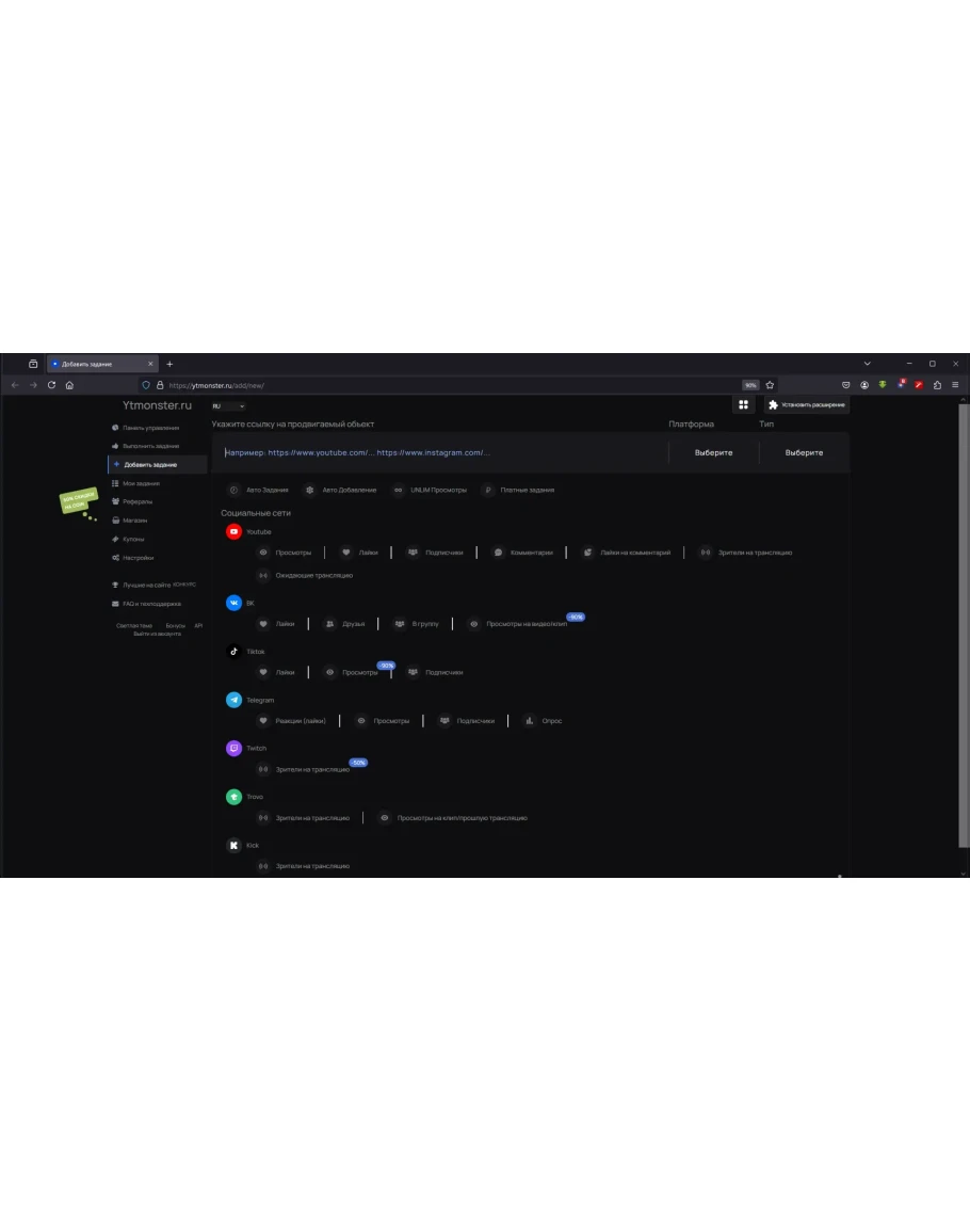 В сервисе YTmonster Вы можете заказать привлечение подписчиков, лайков, просмотров, комментариев, зрителей на трансляцию для Ютуб, ВКонтакте, ТикТок, Телеграм, Твич, Трово, Кик, Инстаграм.