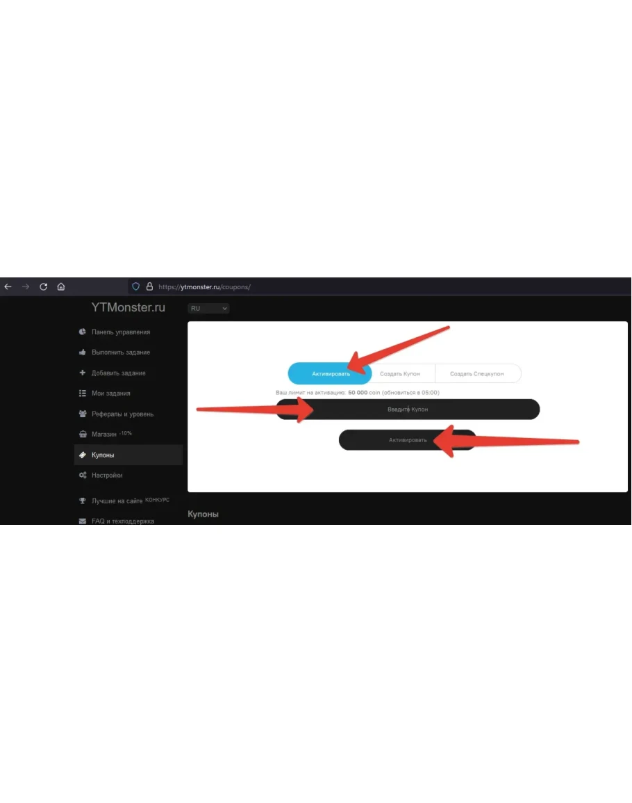 После оплаты Вы получите купон сервиса YTmonster .RU, выбранного номинала, который можете активировать в соответствующем разделе личного кабинета в данном сервисе.