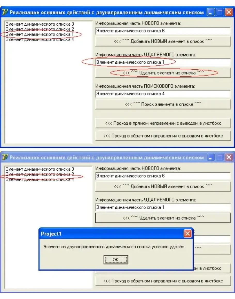проход по списку в прямом и обратном направлении с выводом на экран информационных частей элементов