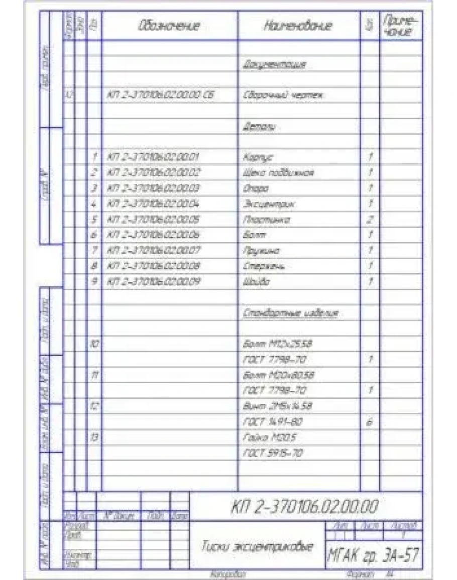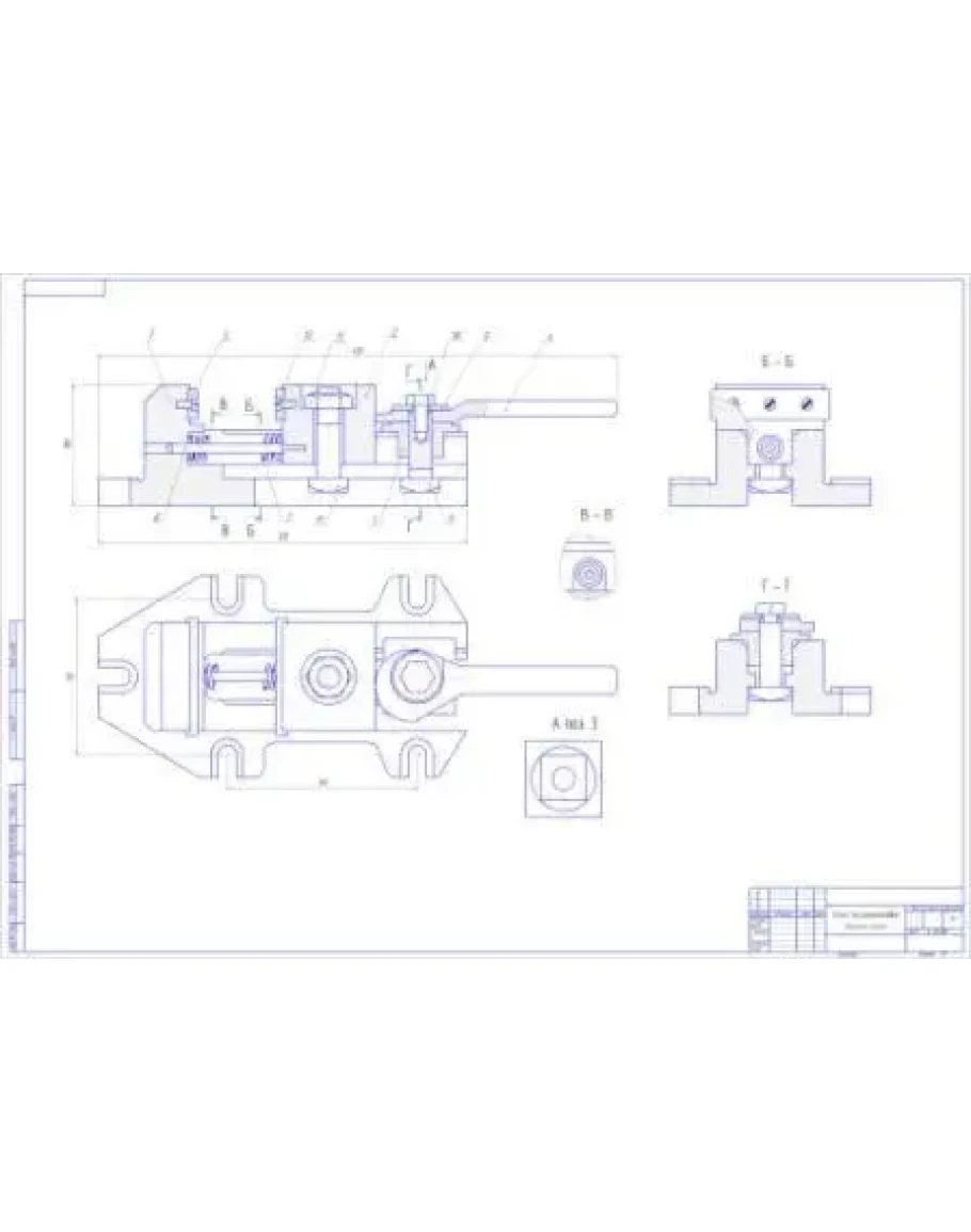 Тиски эксцентриковые, сборочный чертеж, спецификация, деталировка детали №1. Чертежи в компасе+ jpg