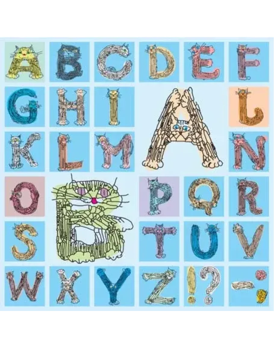 Рисованные буквы английского алфавита, стилизованные в шуточном стиле, в виде кошек. Векторная графика.