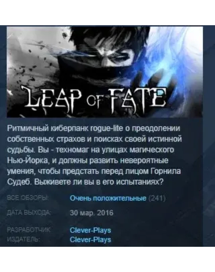 Leap of Fate - это уникальная смесь изометрической перспективы, ритмичного экшена и элементов стиля rogue-like. Вы играете за одного из четырёх техномагов, скрывающихся в нью-йоркских сумерках, которому предстоит пройти череду испытаний в Горниле Судеб. Этот мистический полигон известен своей способностью сталкивать магов лицом к лицу с их худшими внутренними демонами. Вы пройдёте по пути, полному жестоких сражений и усеянному хитроумными смертельными ловушками. Вашими инструментами станут стремительный сумрачный бег, могущественные глифы и уникальные магические способности, которые вы сможете развивать в течение всей игры. Какая же награда ждёт выжившего? Невероятная сила и шанс узнать свою истинную судьбу.