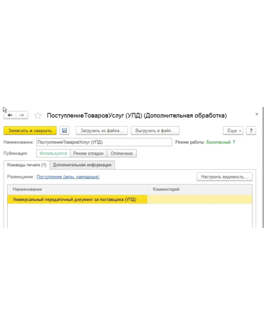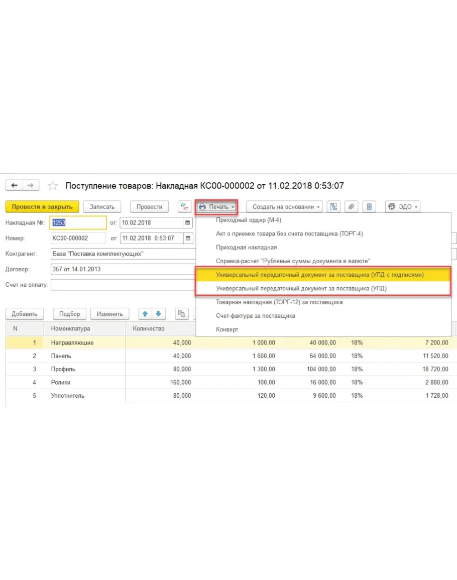 После этого в подменю "Печать" документа "Поступление товаров и услуг" появится новая команда печати - "Универсальный передаточный документ за поставщика (УПД)" или "Универсальный передаточный документ за поставщика (УПД с подписями)", в зависимости от выбранного файла.