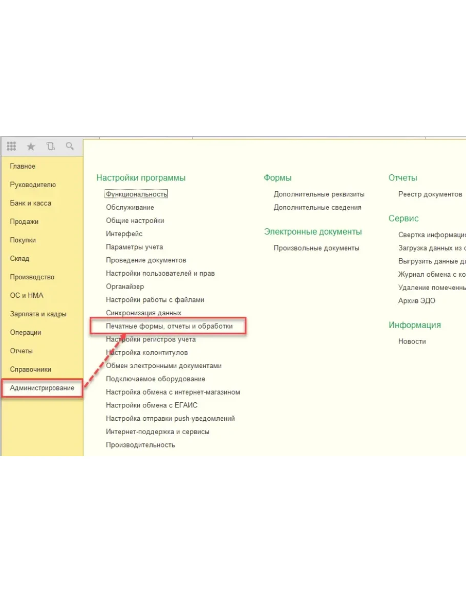 Печатная форма подключается через механизм дополнительных отчетов и обработок. Для подключения необходимо перейти в раздел "Администрирование" - "Печатные формы и обработки".