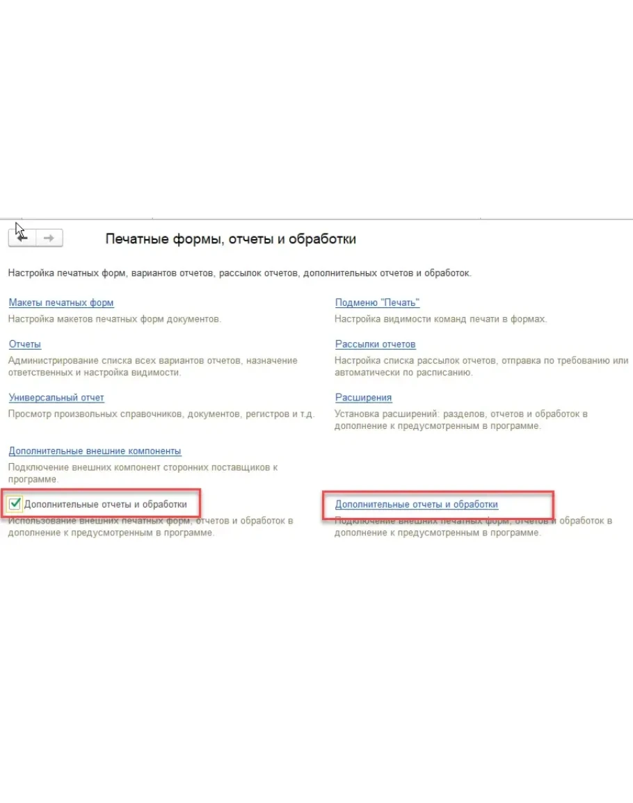 Если в программе не включена возможность работы с дополнительными отчетами и обработками, необходимо установить флаг "Дополнительные отчеты и обработки", затем перейти по гиперссылке "Дополнительные отчеты и обработки".