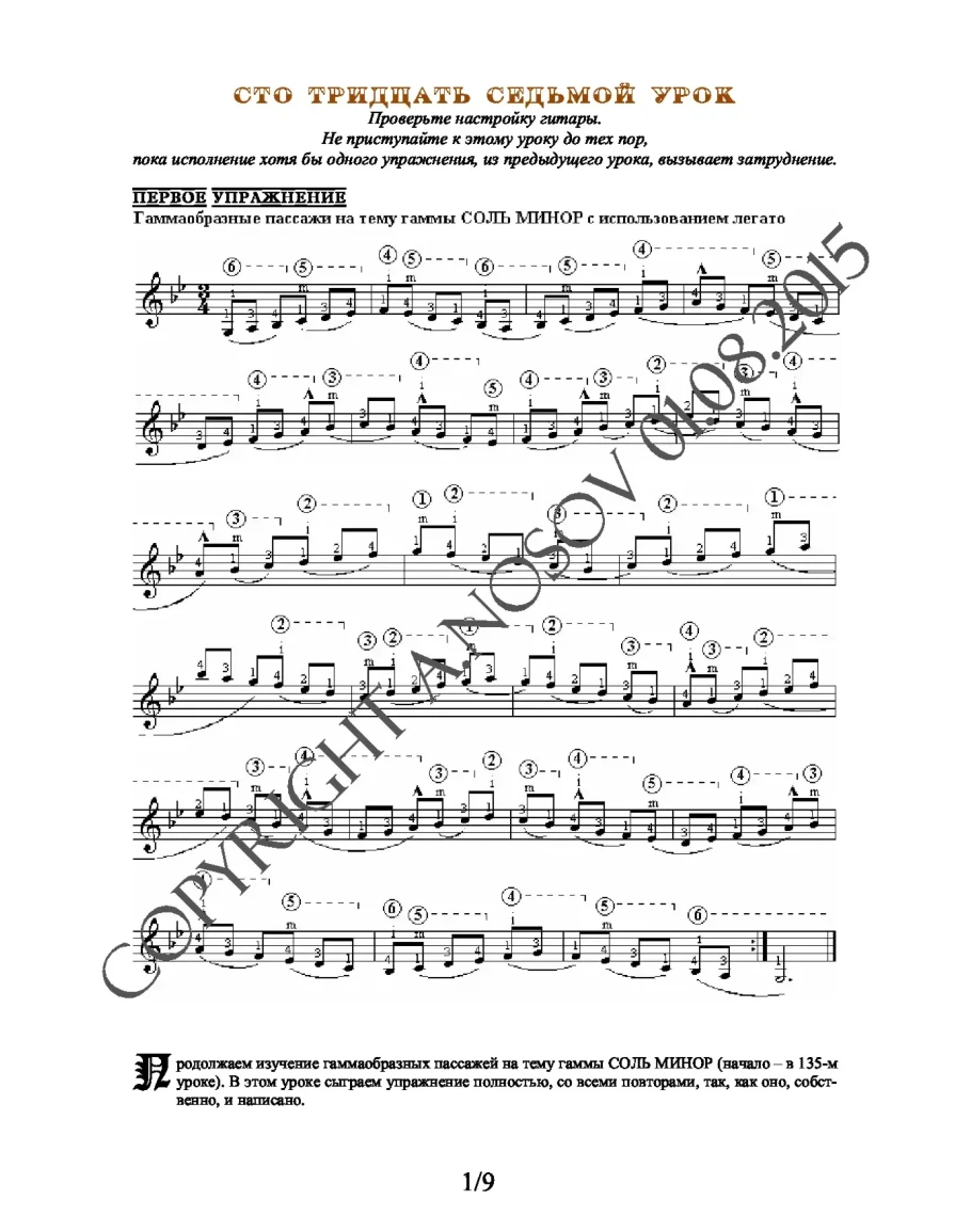 #Exercise 1: G(SOL)-MINOR scale passage with the "Legato" technique (the whole passage). #Exercise 2: Variation of E(MI)-MAJOR scale in double tenths. #Exercise 3: Downward Gruppettos (1 exercise). #"MORNING OF CARNIVAL" from the film "BLACK ORPHEUS" (L.Bonfa), bars 30 – 37.