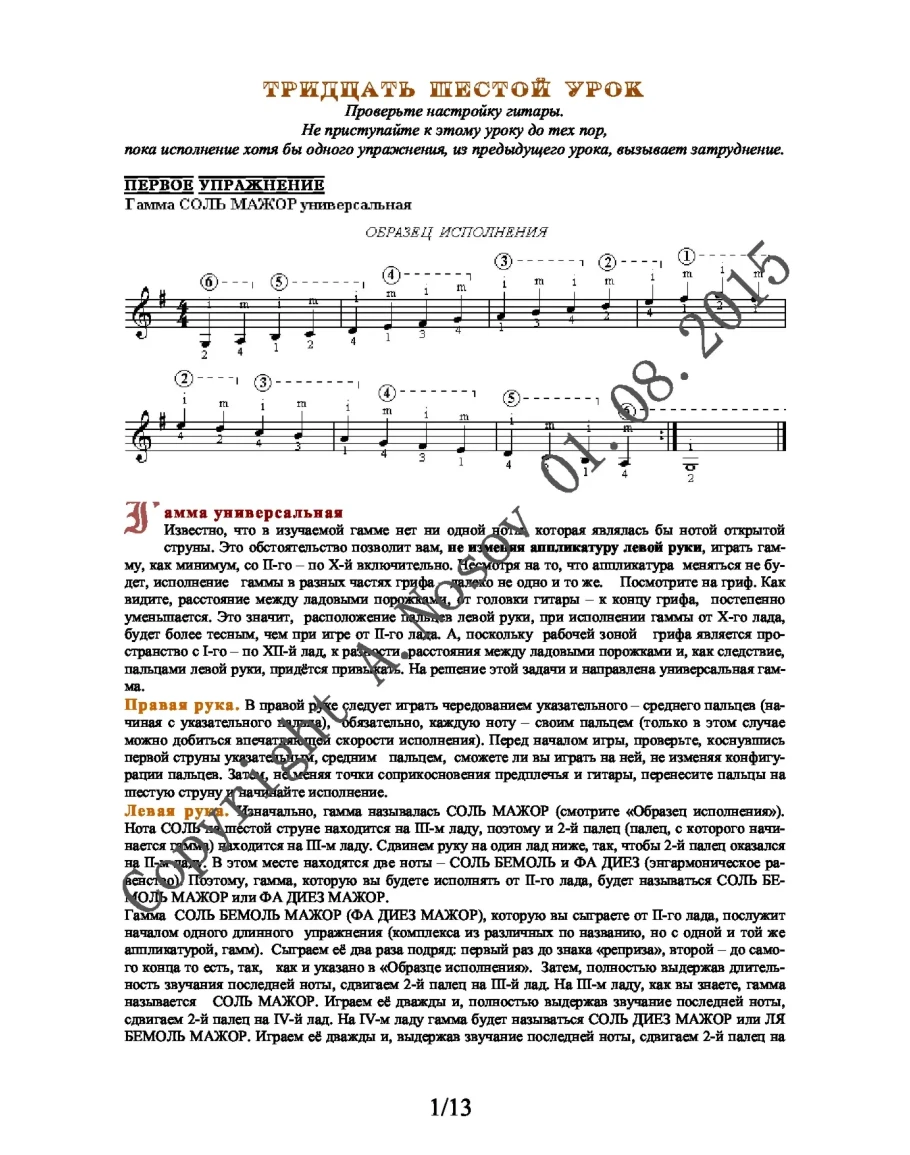 #Exercise 1: G(SOL)-MAJOR scale – universal. #Exercise 2: Arpeggio, type 39, 40. #Exercise 3: Chord succession – G, Gm, F, Gm, F, G, F. #"GRUSTNY NAPEV" (English translation: "Sad Melody") (A.Ivanov-Kramskoi), bars 1– 8. #Notes on the second string from fret V up to and including fret XII.