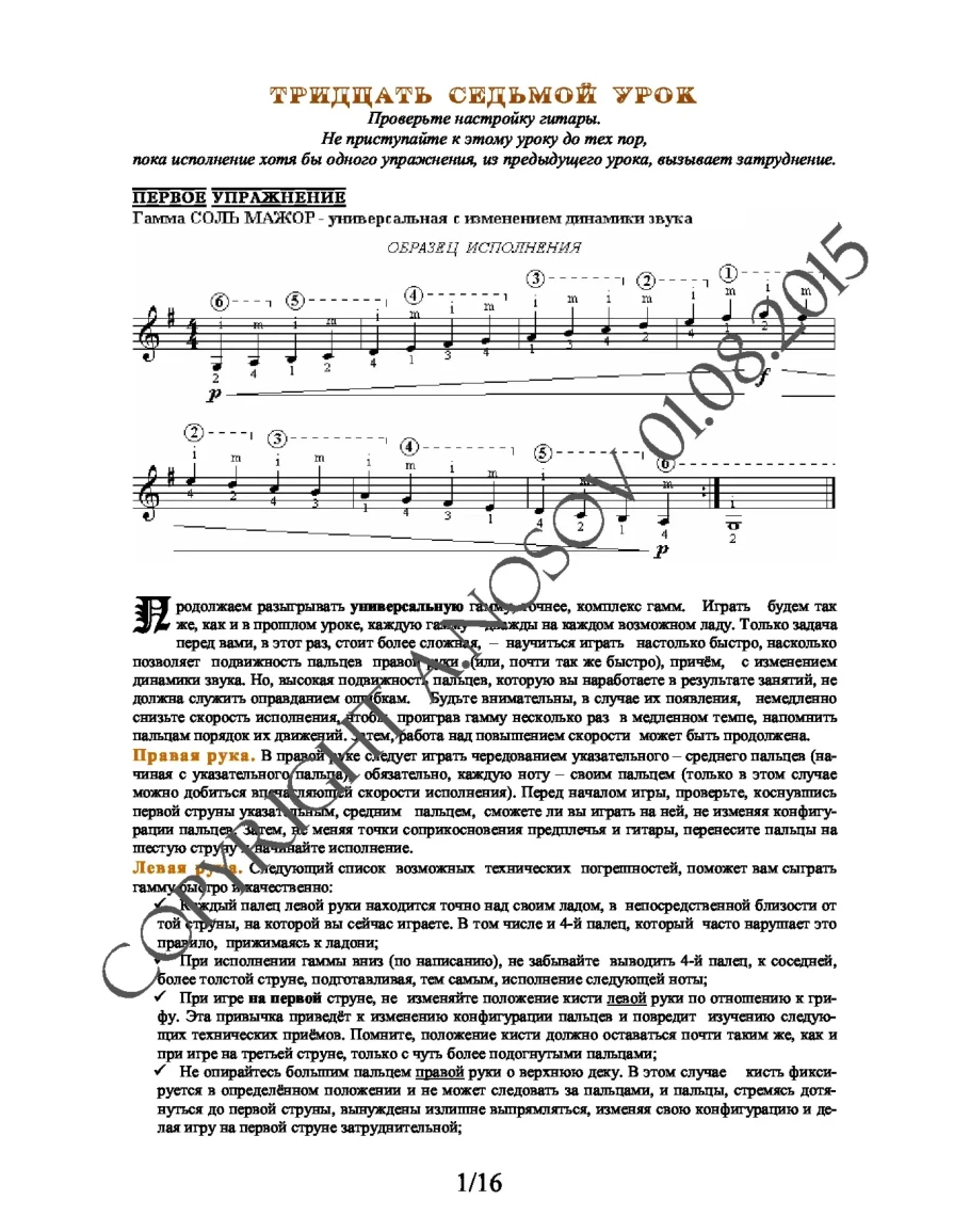 #Exercise 1: G(SOL)-MAJOR scale – universal, with changing dynamics. #Exercise 2: Arpeggio, type 41, 42. #Legato: Hammer-On. #Exercise 3: Hammer-On (10 exercises). #"GRUSTNY NAPEV" (English translation: "Sad Melody") (A.Ivanov-Kramskoi), bars 9 – 16. #Notes on the third string from fret V up to and including fret XII.