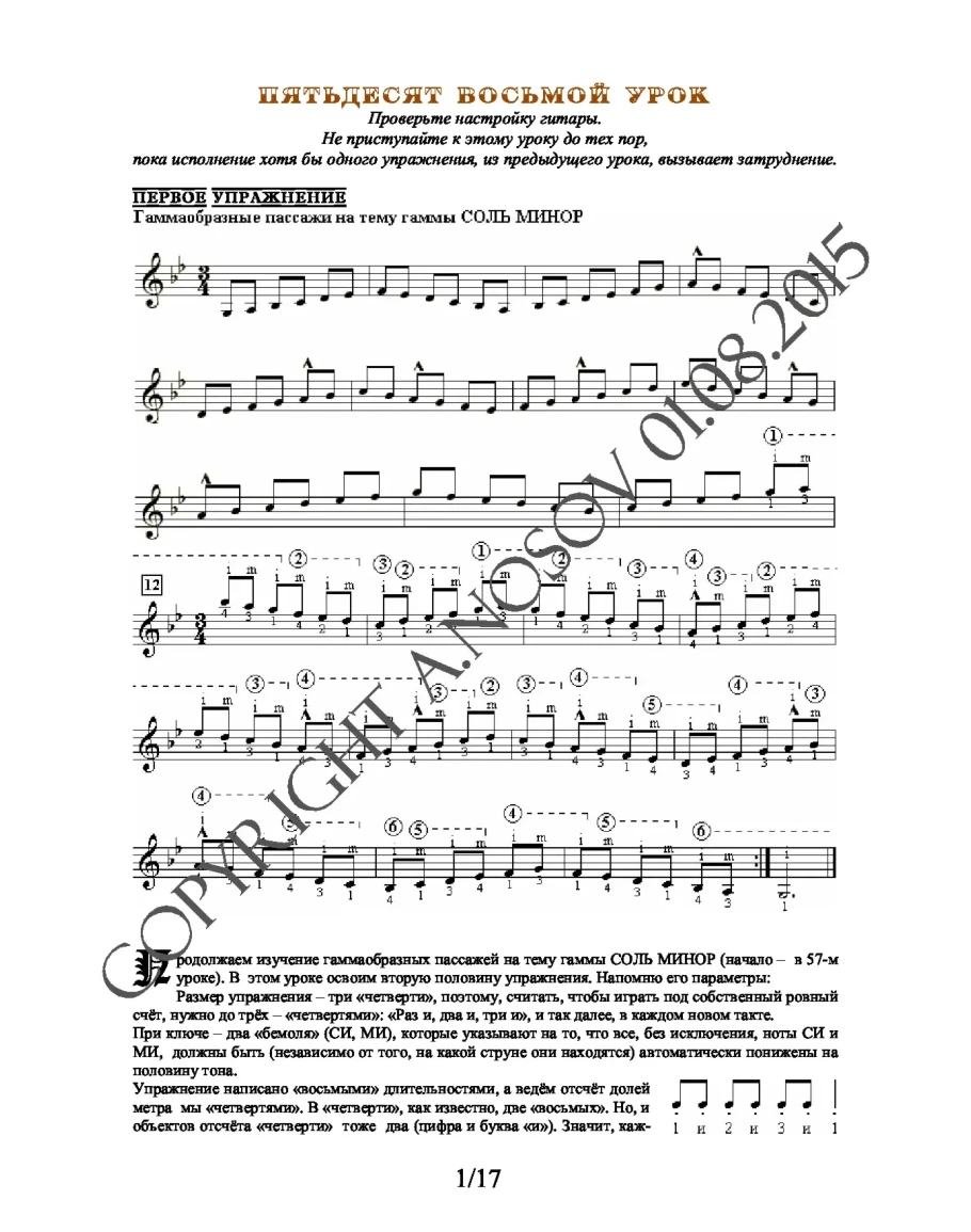 #Exercise 1: G(SOL)-MINOR scale passages (second half). #Exercise 2: "Anticipation" (5 exercises). #Exercise 3: А) Hammer-On/Pull-Off (8 exercises); B) Hammer-On/Pull-Off with "Barre" Chords (1 exercise). #Music from the film "THE SANDPIT GENERALS" (L.Oliveira), bars 25 – 30.