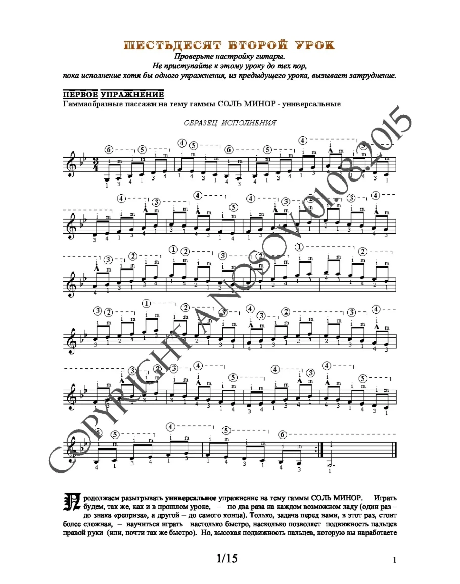 #Exercise 1: G(SOL)-MINOR scale passages – universal (acceleration of the performance speed). #Exercise 2: cale on one string (minor scale with one finger.) #Exercise 3: А) Hammer-On/Pull-Off (8 exercises); B) Hammer-On/Pull-Off with "Barre" Chords (1 exercise). #"LA PEREGRINACION, ALOUETTE" (A.Ramírez), bars 18 – 25.