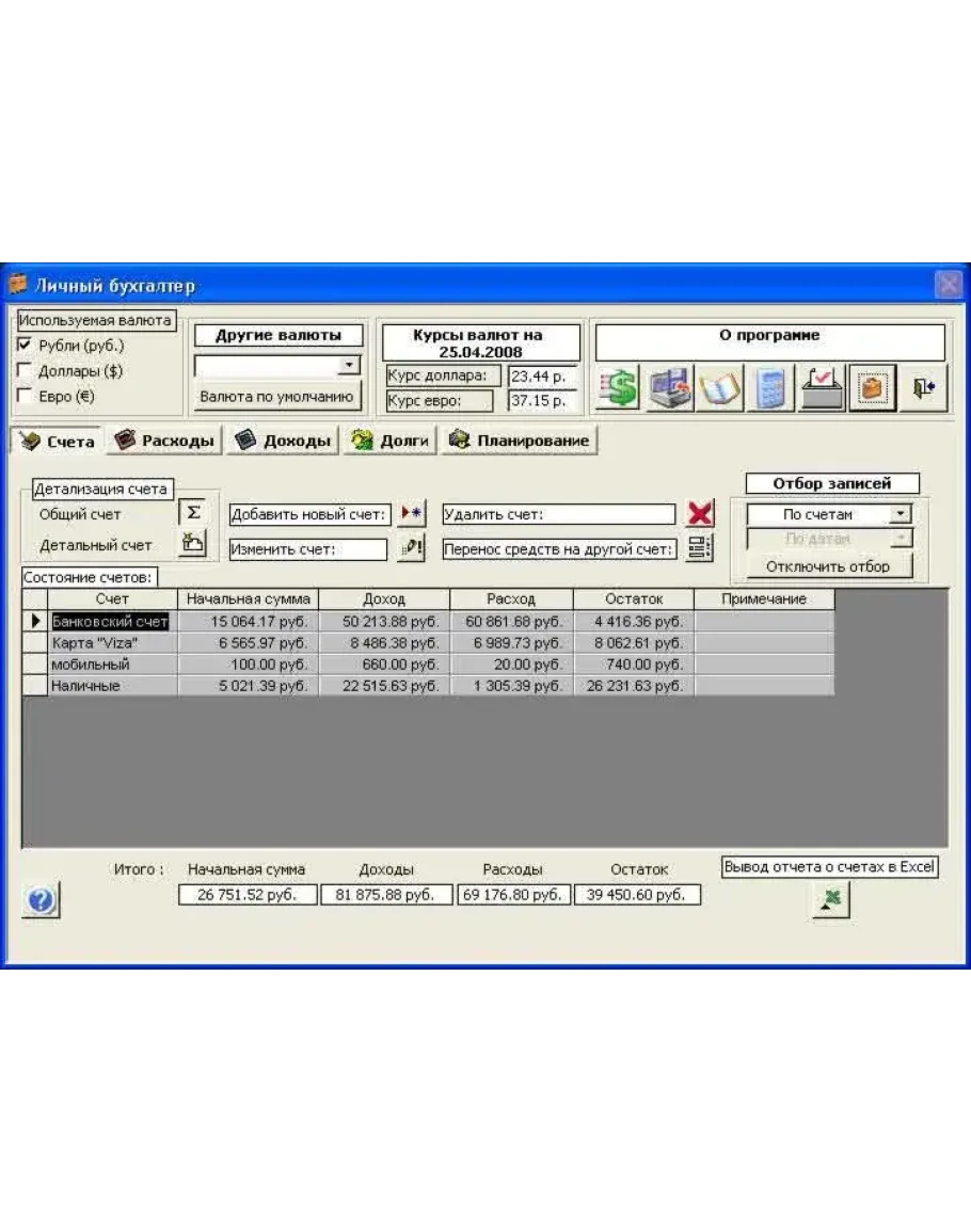 • Вести учет движения денежных средств на своих счетах (банковские счета и карты, мобильный телефон, наличные и т. д.) во всех основных видах валюты, начиная с рубля, доллара, евро и кончая китайскими юанями и японскими йенами; также возможно использование украинских гривен, белорусских рублей и казахских тенге;